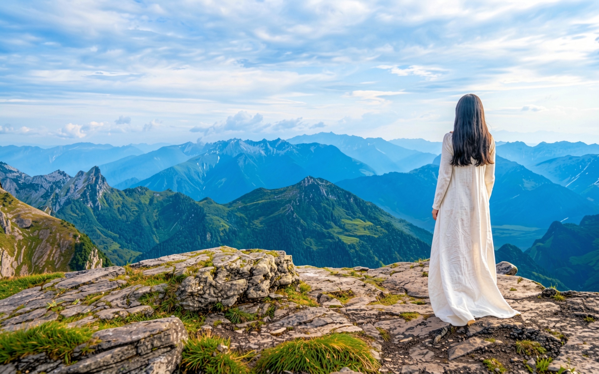 Изображение характеризуется высокой детализацией текстуры ткани платья и шероховатости горных пород. Мягкое естественное освещение создает плавные градиенты в голубых тонах удаленных хребтов, а контрастные тени подчеркивают рельеф скал на переднем плане. Сайт предоставляет удобный предпросмотр перед загрузкой для оценки качества отображения всех элементов сцены на экране.