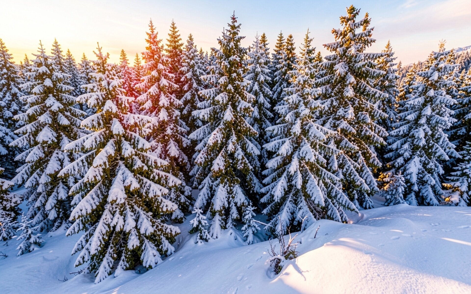 Изображение детально передает текстуру свежевыпавшего снега на ветвях елей, создавая выразительный контраст между холодными голубыми тенями и теплыми золотистыми бликами. Градиент неба плавно переходит от мягкого оранжевого к светло-голубому, подчеркивая объем каждой кроны. Сайт предоставляет удобный предпросмотр перед скачиванием, чтобы оценить качество цветопередачи на вашем экране.