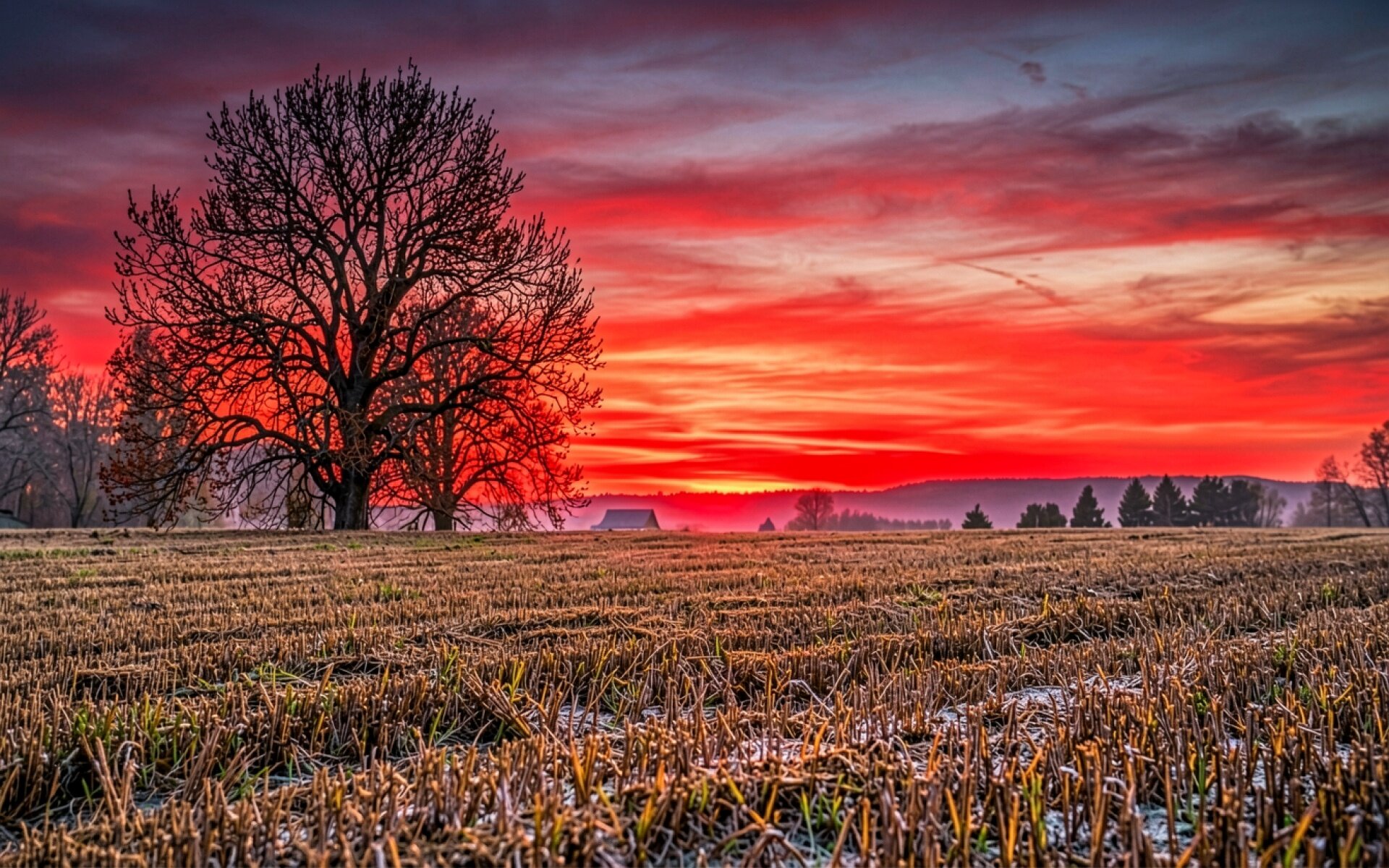 Скачайте с нашего сайта обои Одинокое дерево в поле на красном закате в формате JPG, так как только здесь представлена оригинальная компрессия с минимальными потерями.