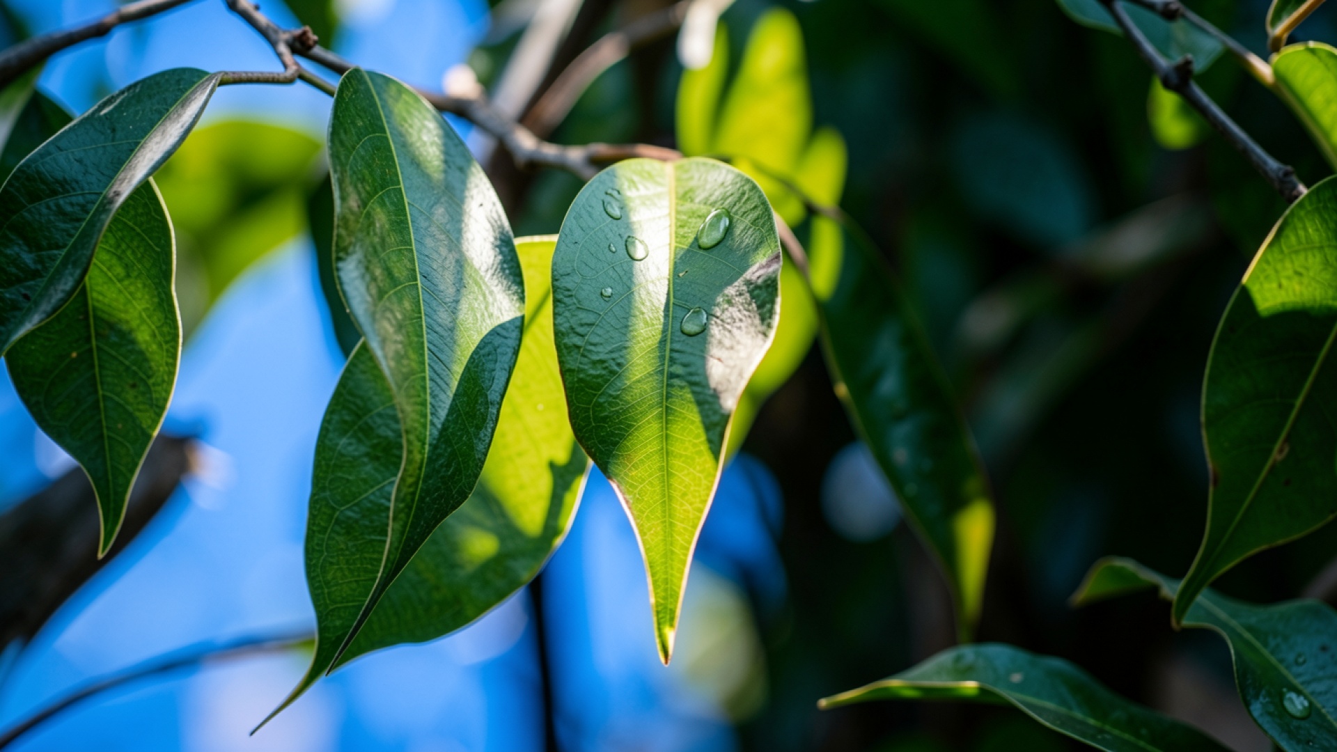 Изображение детально передает глянцевую текстуру листовых пластин и прозрачность водяных капель. Контрастное освещение создает четкие блики на поверхности растений и мягкие градиенты на синем фоне неба. Глубокие тени подчеркивают объем каждой жилки листа, а естественная цветовая гамма обеспечивает визуальный баланс. На сайте доступен удобный предпросмотр перед скачиванием для оценки качества на экране.
