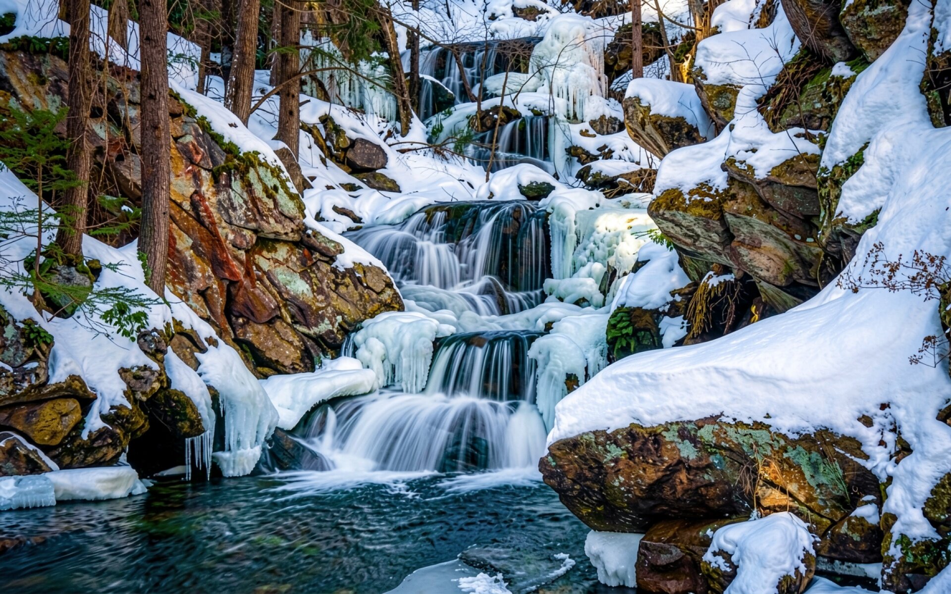 Изображение детально передает текстуру обледенелых скал и мягкие переходы белого снега. Освещение подчеркивает динамику падающей воды, создавая контраст между холодными бликами льда и темными участками мокрых камней. Глубокие тени в расщелинах добавляют объема всей композиции. На сайте доступен удобный предпросмотр перед скачиванием, чтобы оценить качество отображения на вашем экране.