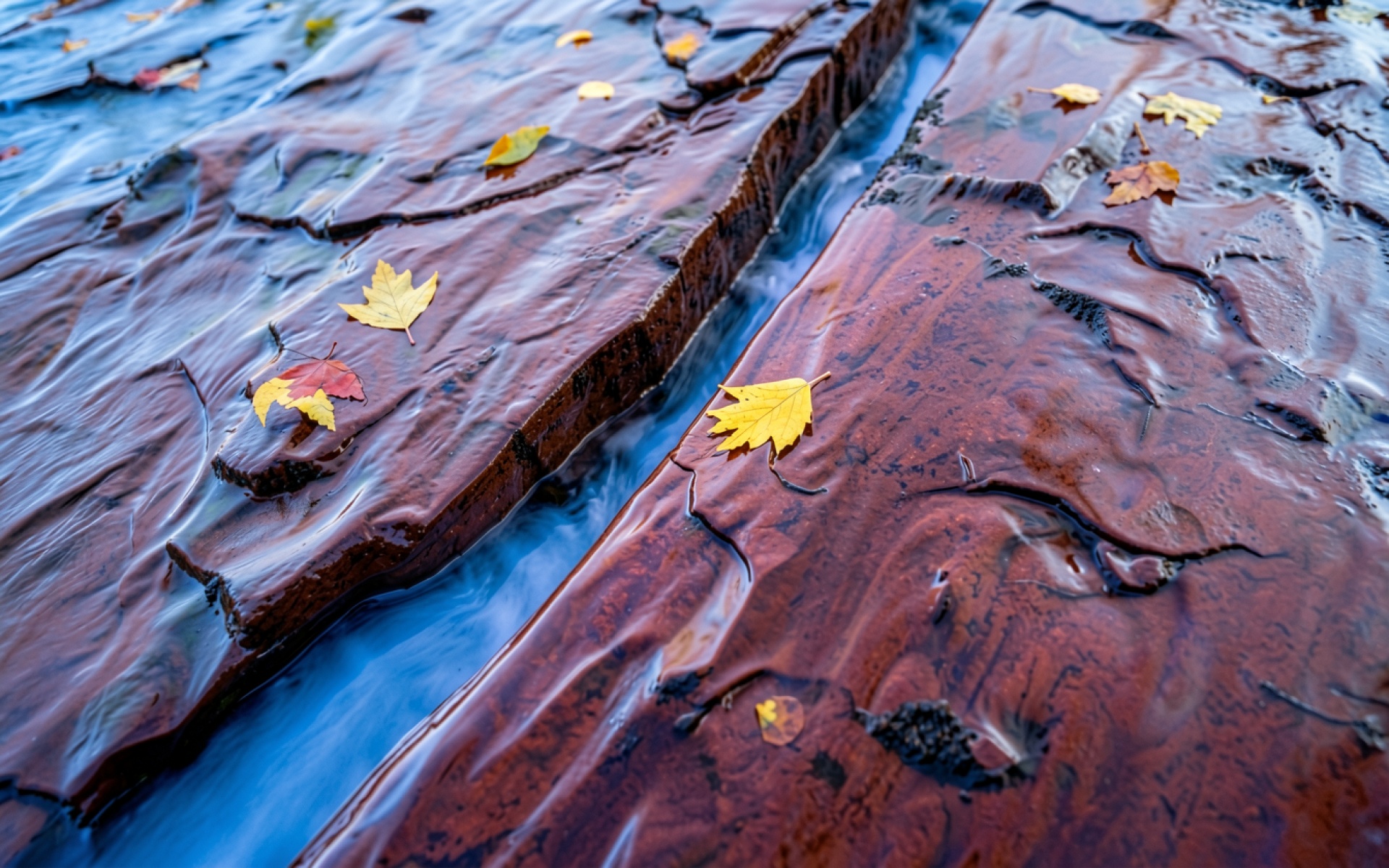 Доступны для скачивания JPG обои 'Осенние желтые листья на мокрых красных скалах'. Почему стоит скачать их? Только этот JPG сохраняет метаданные цветокоррекции.