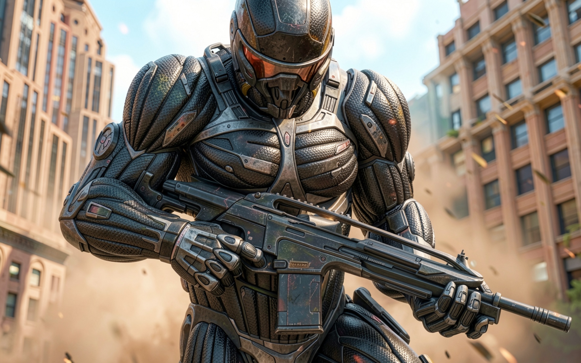 Изображение детально передает текстуру композитного металла и матового пластика защитного костюма. Освещение создает четкие блики на шлеме и глубокие тени в складках бронепластин, подчеркивая объем фигуры. Градиенты городского фона плавно переходят от пыльно-бежевых тонов зданий к светлому небу, создавая контраст с темным силуэтом бойца. Перед загрузкой доступен удобный предпросмотр для оценки качества отображения на вашем экране.