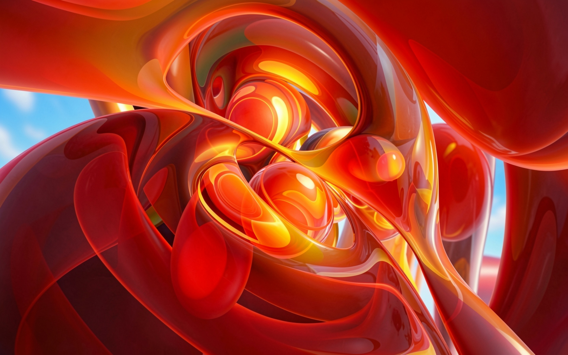 Изображение характеризуется сложной игрой света на глянцевых поверхностях сфер. Глубокие красные градиенты плавно переходят в ярко-оранжевые блики, создавая эффект внутреннего свечения. Четкие отражения и мягкие тени подчеркивают объем стеклянных структур, а плавные изгибы фона добавляют динамики композиции. На сайте доступен удобный предпросмотр перед скачиванием для оценки качества на экране.