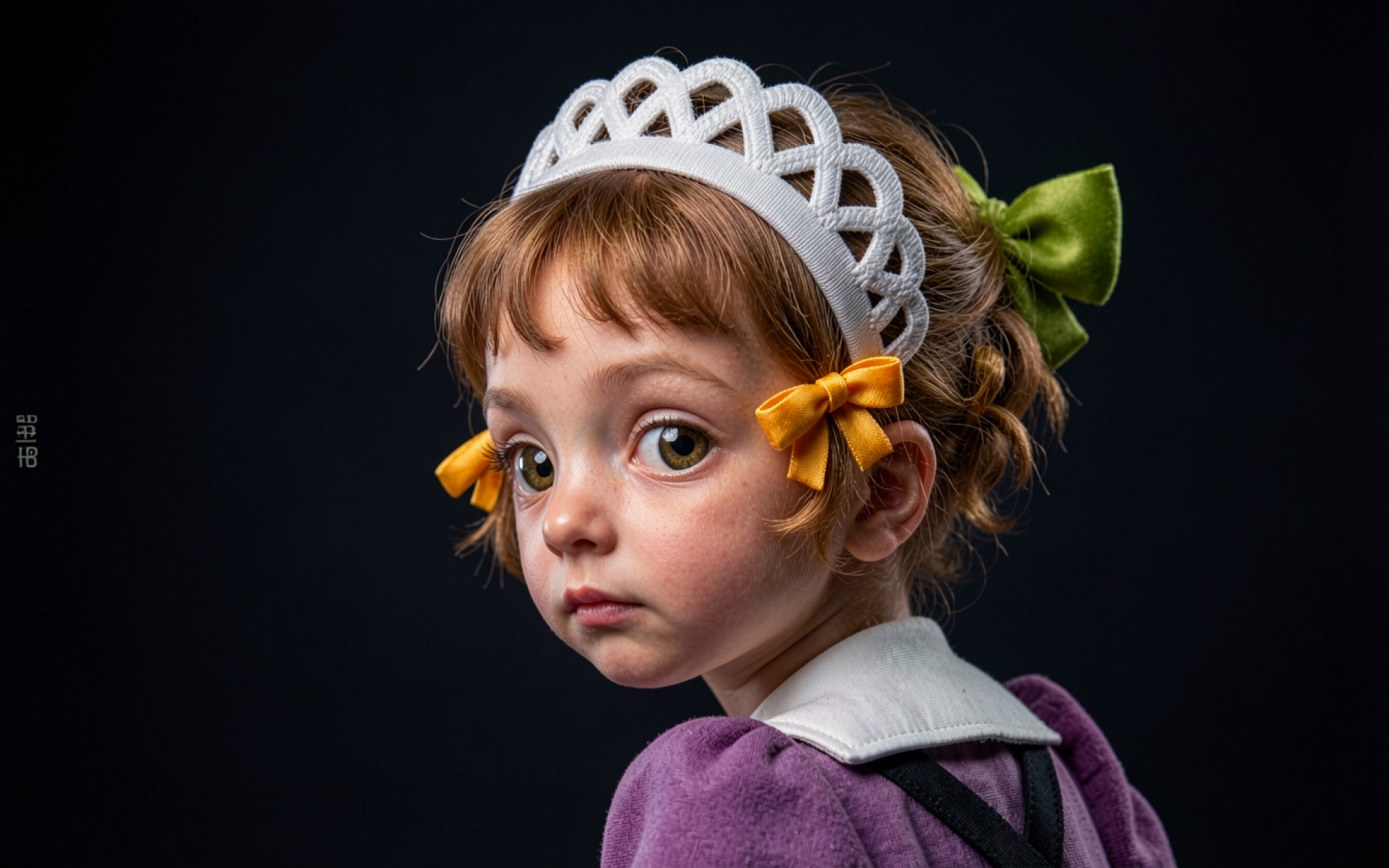 Изображение отличается детальной проработкой текстуры кожи и мягким освещением, которое создает плавные переходы теней на лице. Белый пластик короны контрастирует с темным фоном, а желтые банты добавляют яркие цветовые акценты. Градиенты в области волос передают естественный рыжеватый оттенок под направленным светом. На сайте доступен удобный предпросмотр перед загрузкой для оценки качества на экране.