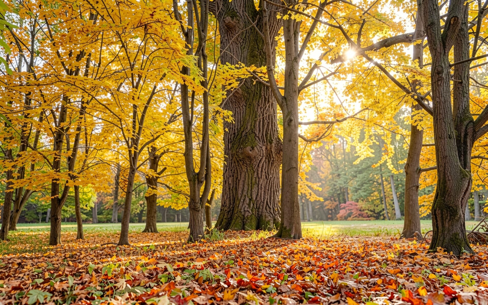 Изображение детально передает текстуру грубой коры старых деревьев и тонкие прожилки опавших листьев на переднем плане. Контровой свет создает яркие блики на золотистой листве, формируя мягкие градиенты от насыщенного желтого к глубокому коричневому в тенях. Перед скачиванием доступен удобный предпросмотр для оценки цветопередачи и четкости объектов на вашем экране.