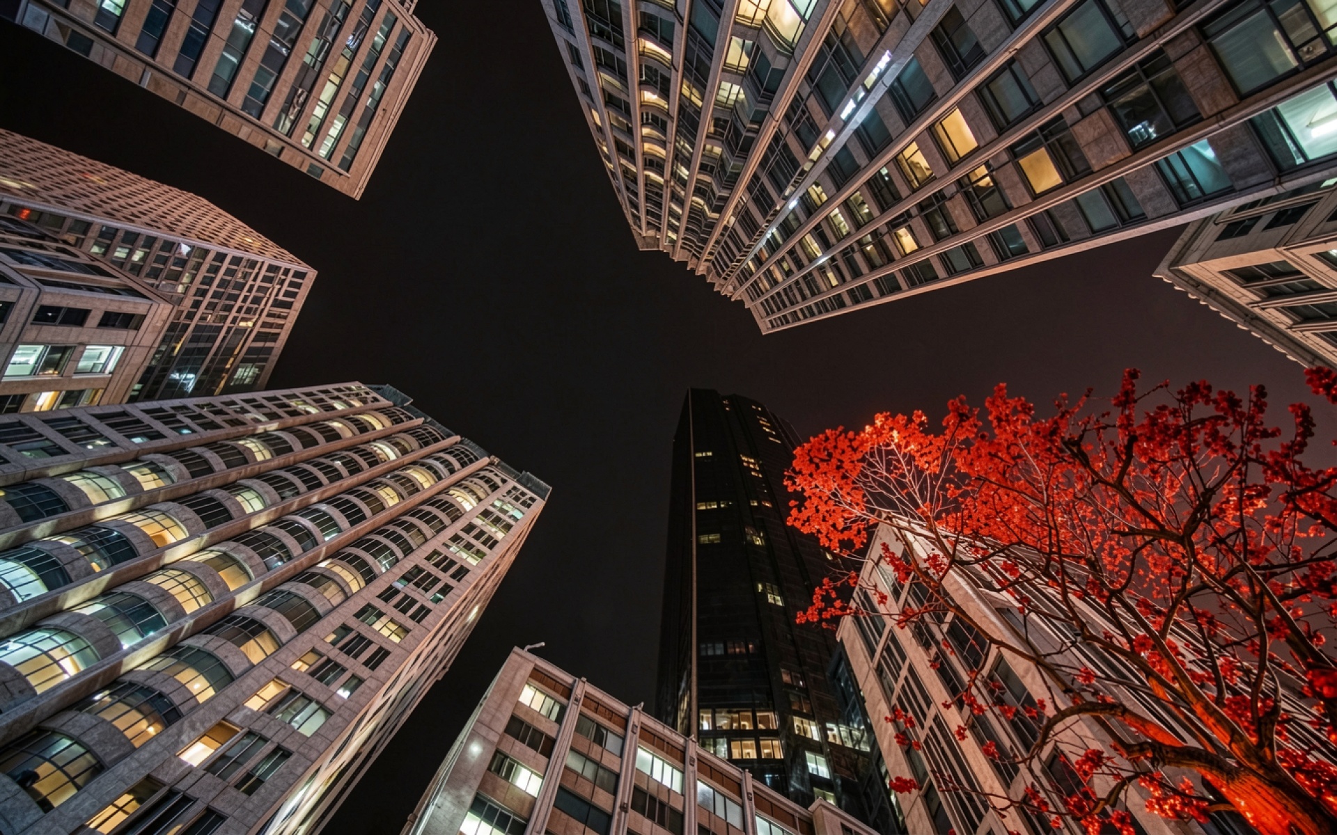 Ночной город с красным деревом и небоскребами обои