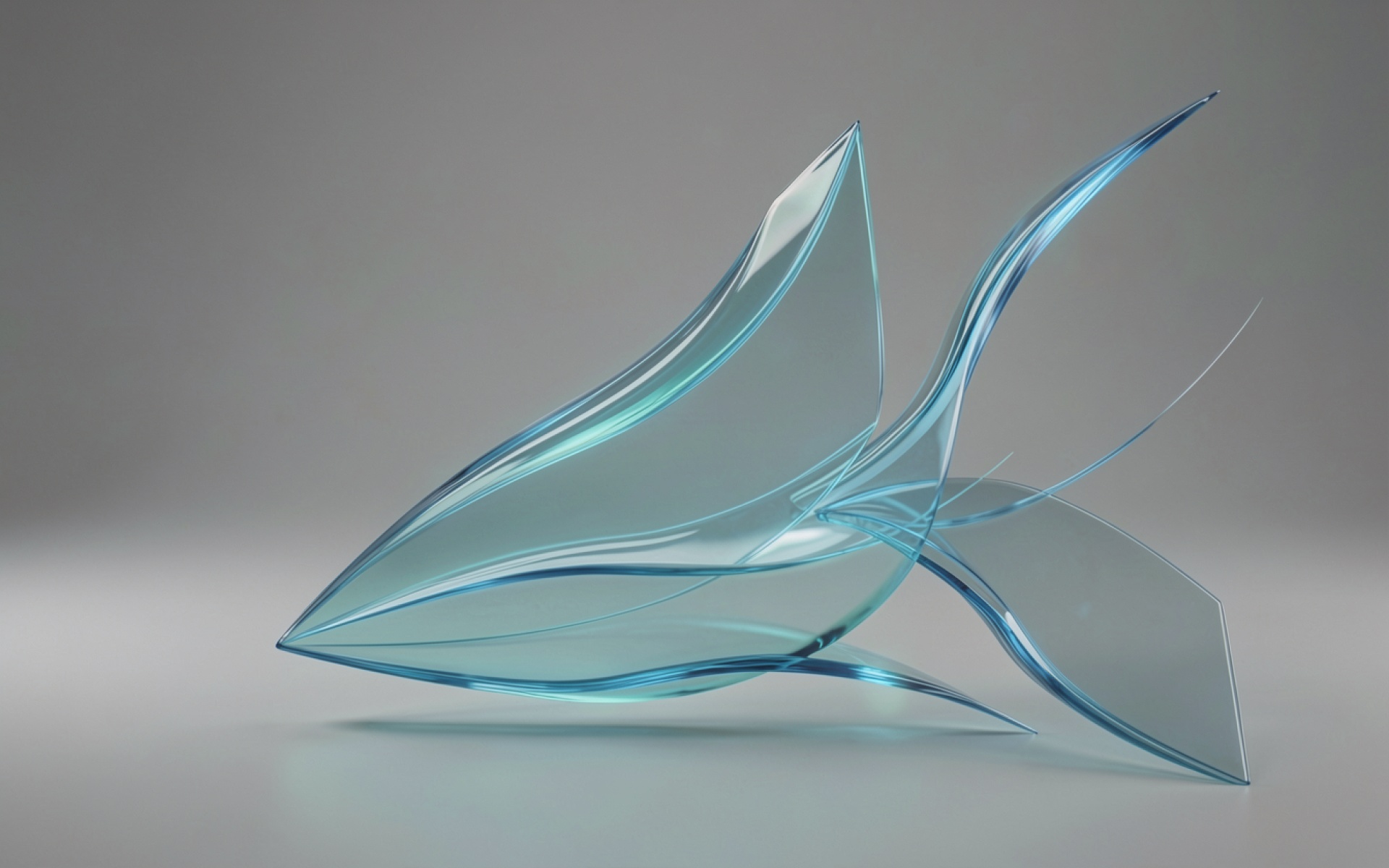 Изображение фокусируется на прозрачности материала и преломлении света внутри стеклянного объекта. Текстуры имитируют полированный хрусталь с плавными градиентами от глубокого синего к почти бесцветному. Освещение создает мягкие блики на изгибах плавников и четкие тени на однотонном сером фоне. Перед загрузкой на сайте доступен удобный предпросмотр для оценки качества отображения всех световых акцентов.