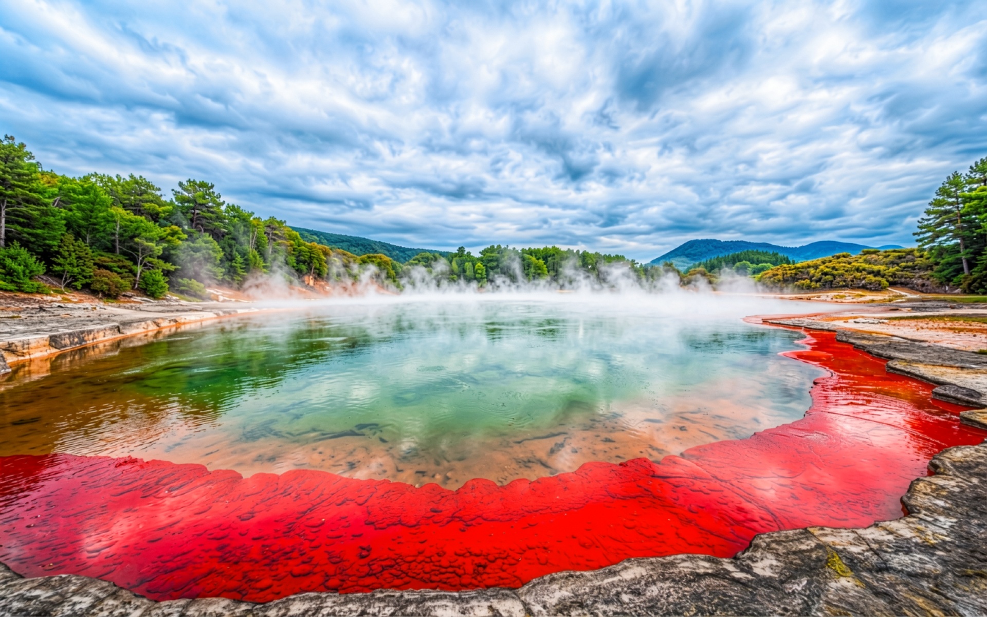 Изображение передает сложную текстуру минеральных отложений и плавные градиенты перехода от ярко-красного к изумрудному цвету воды. Освещение рассеянное, что подчеркивает объем поднимающегося пара и мягкие тени на каменистом берегу. Контраст между насыщенным цветом береговой линии и холодными оттенками неба создает глубокую визуальную динамику. На сайте доступен удобный предпросмотр перед скачиванием для оценки качества на экране.