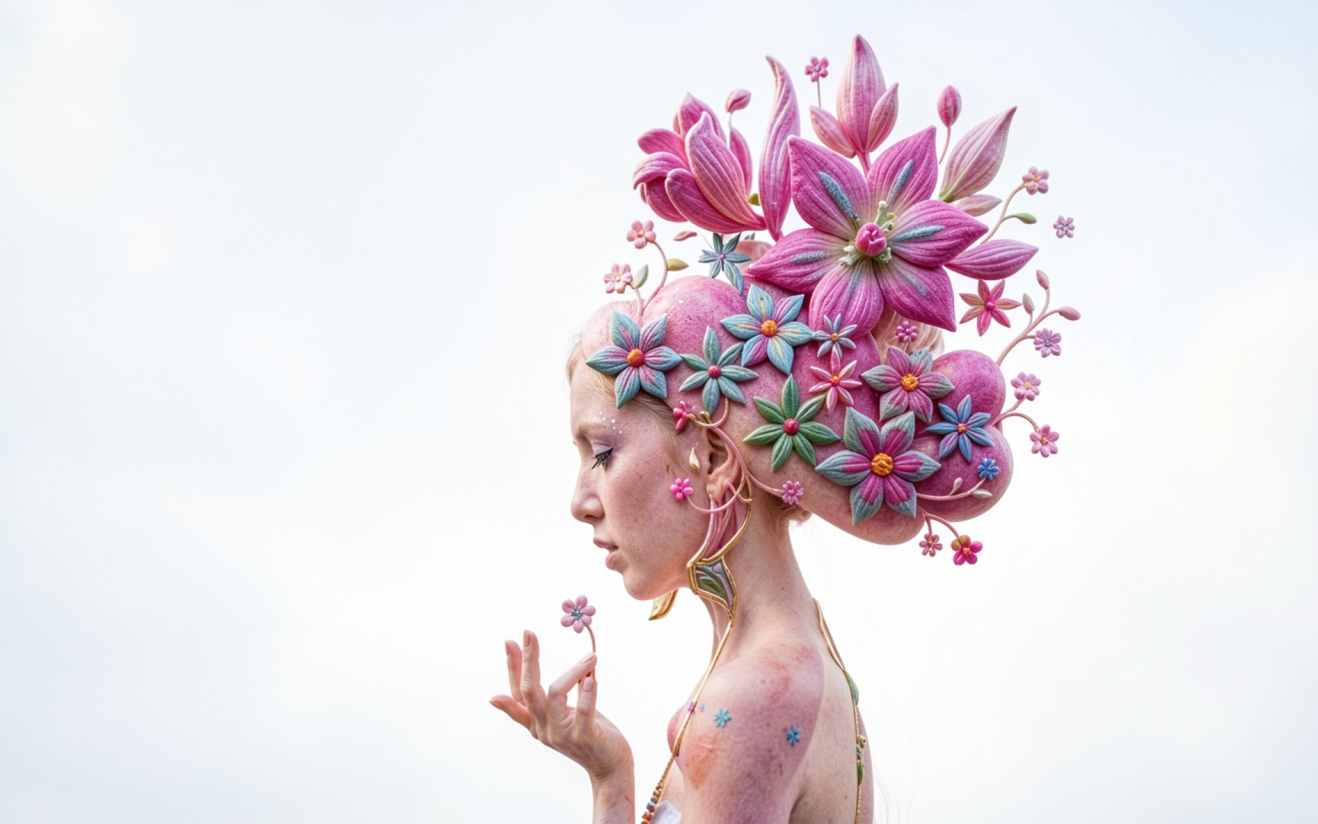 Изображение отличается детальной проработкой лепестков и плавными переходами розовых оттенков. Освещение мягкое, создающее легкие блики на коже и подчеркивающее объем цветочной композиции. Текстуры органических элементов сочетаются с матовым фоном, а глубокие тени в основании венка добавляют сцене реализма. На сайте предусмотрен удобный предпросмотр перед загрузкой для оценки качества на экране.