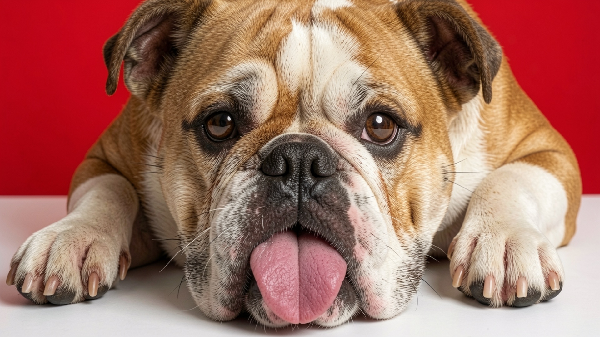 Изображение детально передает текстуру кожи с характерными складками и блеск влажного носа. Освещение направленное, что создает мягкие переходы теней на морде и подчеркивает контраст между насыщенным красным фоном и теплыми оттенками шерсти. Градиенты заднего плана плавно уходят в глубину, выделяя передний план с белой поверхностью. На сайте доступен удобный предпросмотр перед скачиванием для оценки качества на экране.