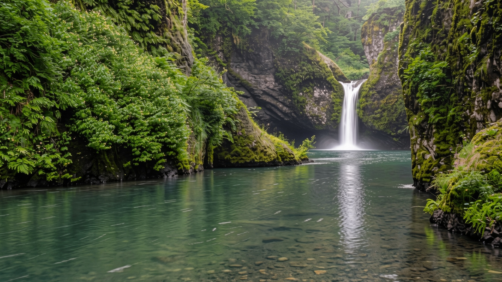 Изображение детально передает текстуру мокрого базальта и насыщенный зеленый оттенок папоротников. Мягкое рассеянное освещение создает плавные градиенты на поверхности воды, а белые блики в зоне падения потока подчеркивают динамику сцены. Глубокие тени в расщелинах скал создают объемный контраст с яркой растительностью. На сайте доступен удобный предпросмотр перед загрузкой для оценки качества на экране.