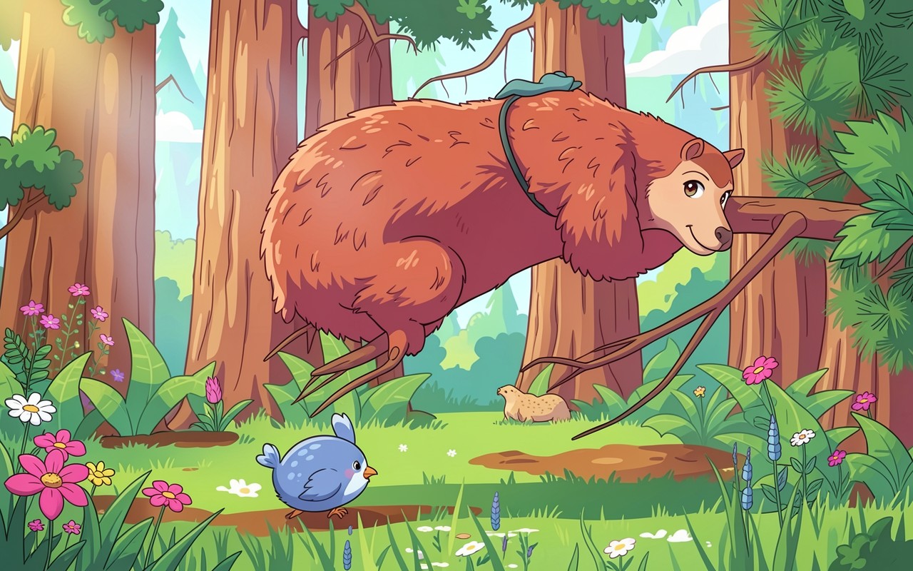Изображение отличается детальной проработкой текстуры шерсти медведя и плавными переходами освещения между стволами деревьев. Мягкие тени ложатся на траву, создавая объем, а яркие блики подчеркивают контуры лесных цветов и оперение птицы. Фон характеризуется многослойным градиентом зеленого и охристого оттенков. На сайте доступен удобный предпросмотр перед скачиванием для оценки качества на экране.
