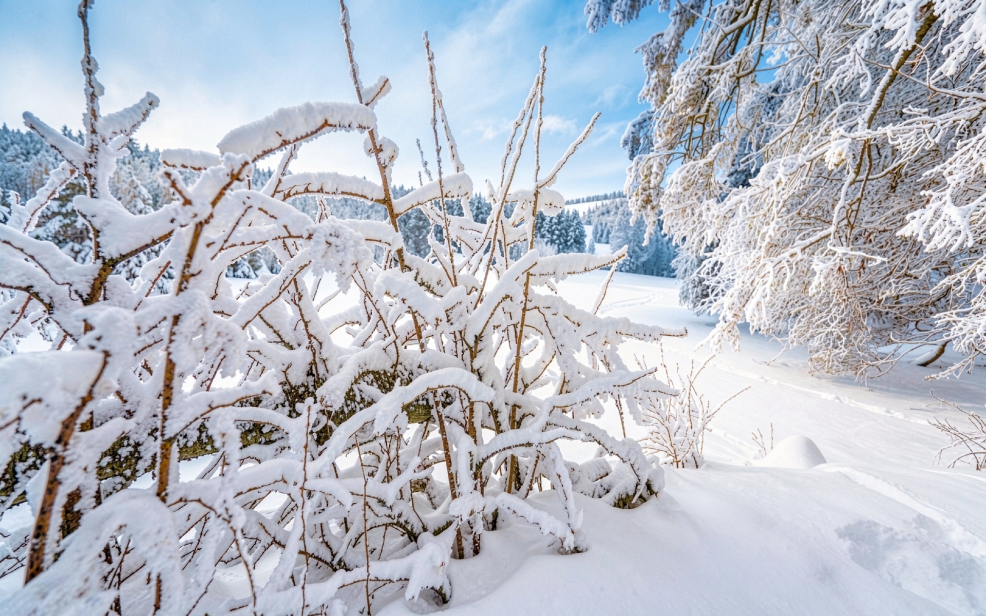 Зимний лес заснеженные ветви голубое небо обои
