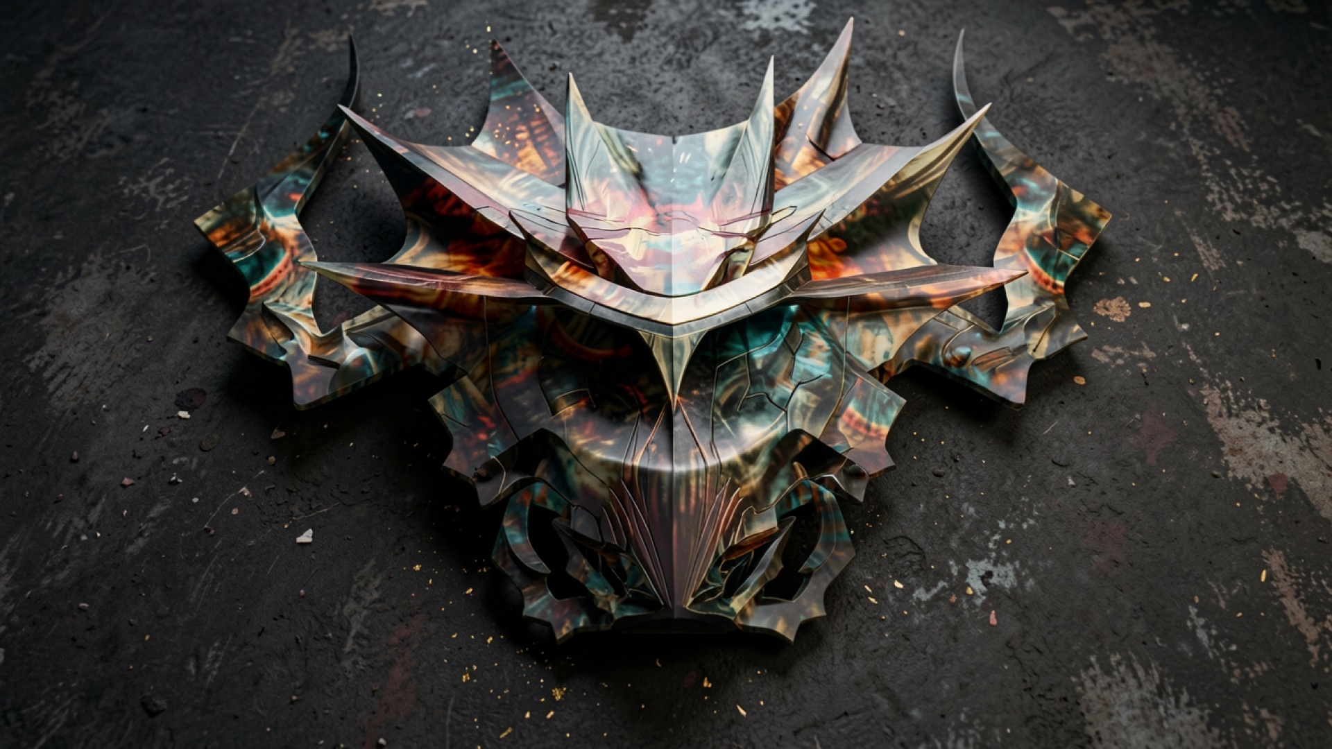 Изображение детально передает текстуру полированного металла с радужными переливами и глубокими тенями. Освещение акцентирует внимание на острых гранях маски, создавая четкие блики на поверхности. Фон представляет собой темную шероховатую поверхность с мелкими частицами пыли, что усиливает контраст с глянцевым объектом. На сайте доступен удобный предпросмотр перед скачиванием для оценки качества на экране.