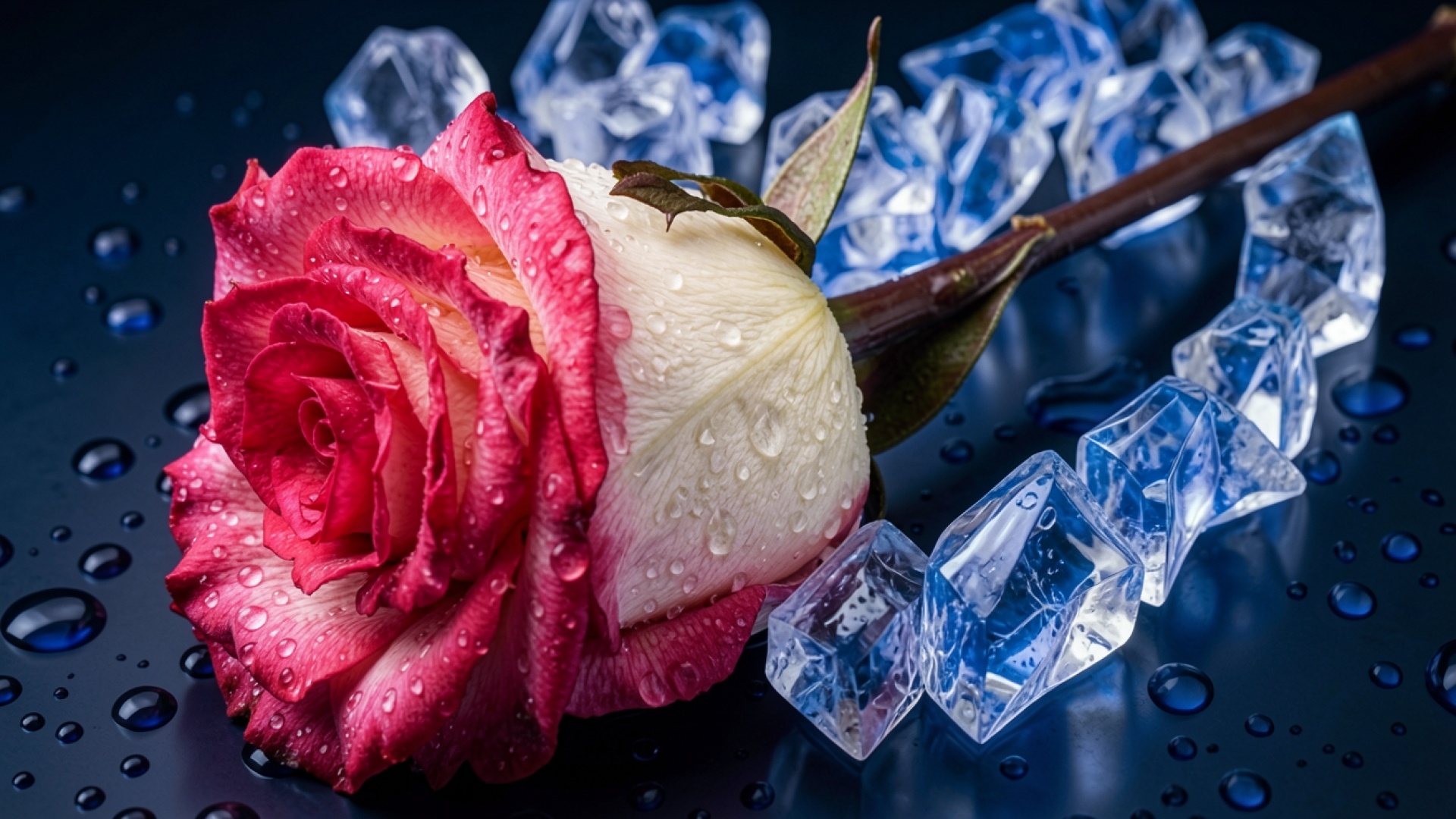 Скачайте с нашего сайта обои Красная роза с каплями воды в кубиках льда в формате JPG, так как они подходят для профессионального редактирования без артефактов.