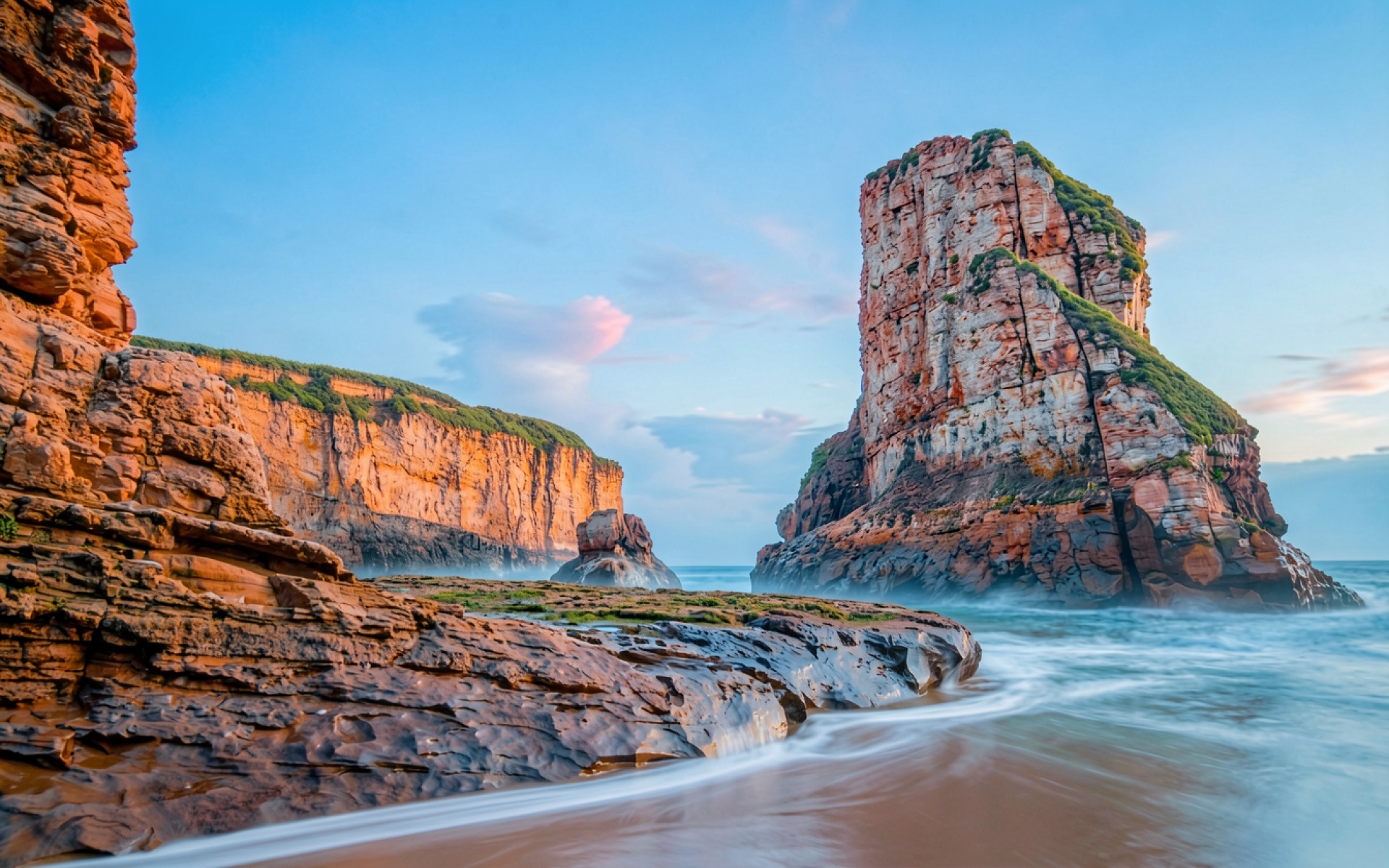 Красные скалы на берегу океана в закатном свете обои