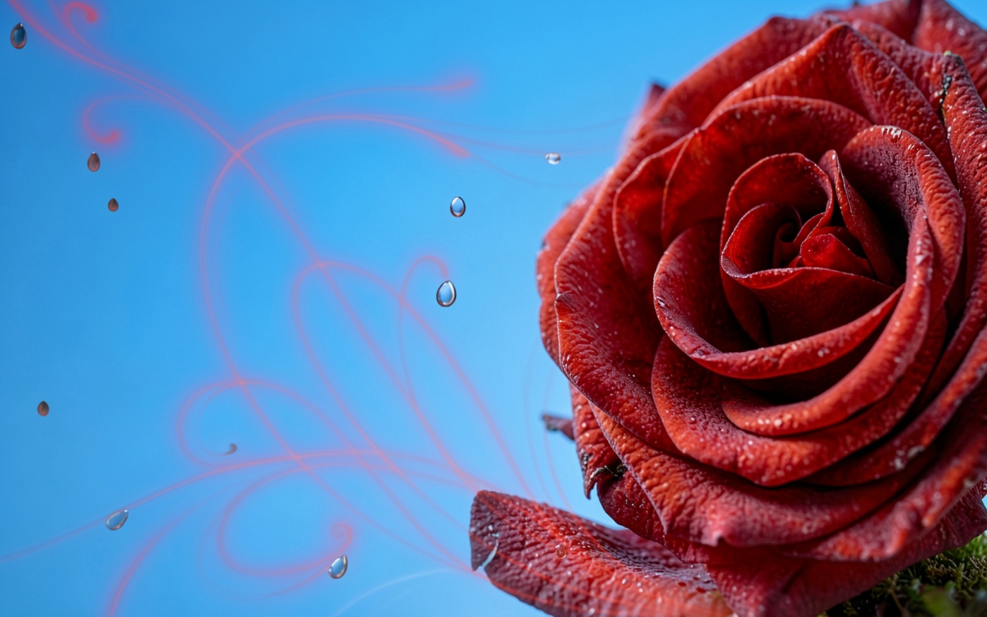 Изображение детально передает бархатистую текстуру лепестков и сферическую форму водяных капель. Контрастное освещение создает четкие блики на поверхности воды и глубокие тени в центре бутона. Плавный градиент синего фона подчеркивает насыщенность красного пигмента, а тонкие светящиеся линии добавляют динамики композиции. На сайте доступен удобный предпросмотр перед скачиванием для оценки качества на экране.