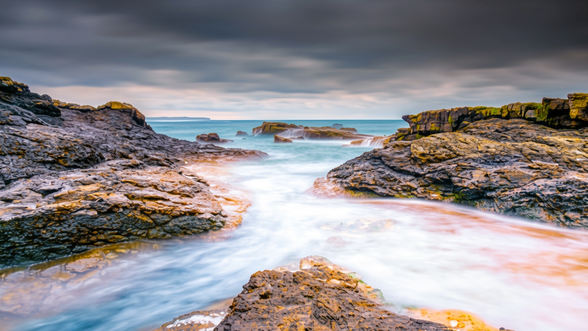 Изображение детально передает шероховатую текстуру базальтовых пород и плавные градиенты прибрежной воды. Контраст между глубокими тенями в расщелинах камней и яркими бликами на поверхности пены создает объемную композицию. Мягкое освещение пасмурного неба равномерно распределяется по сцене, подчеркивая естественные переходы серого и охристого цветов. На сайте доступен удобный предпросмотр перед загрузкой для оценки качества отображения на экране.