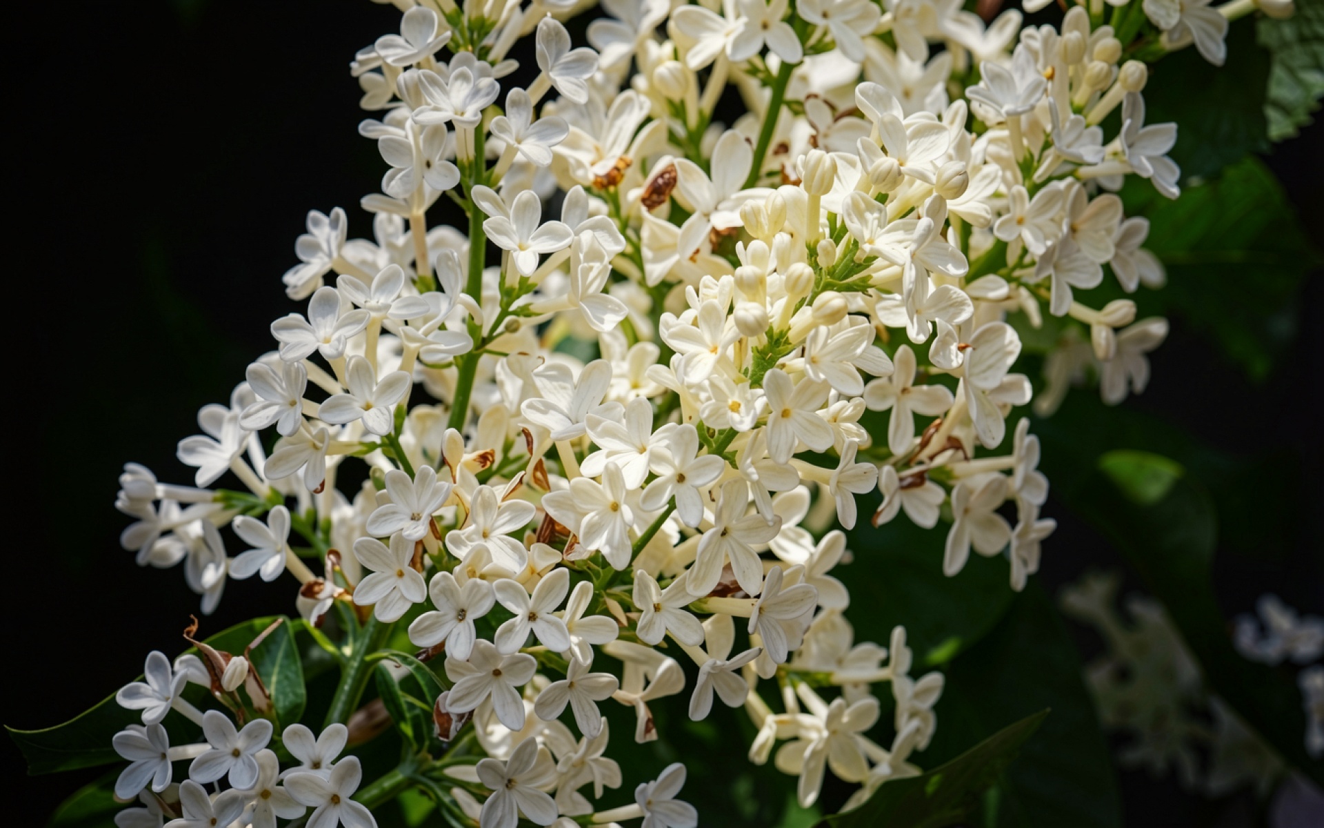 Белые цветы сирени на темном фоне обои