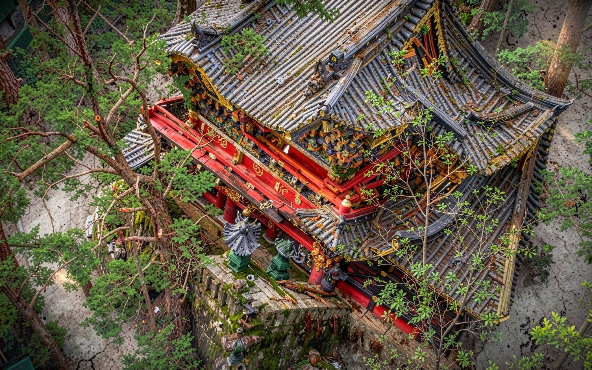 Архитектурные особенности здания включают многоярусную кровлю с характерным изгибом и сложную систему деревянных кронштейнов. Цветовая палитра базируется на контрасте киновари и естественных оттенков мха и хвои. Согласно данным japan-guide.com, красный цвет в синтоистских и буддийских постройках служит оберегом от злых духов. Высокая детализация текстур дерева и камня делает этот файл подходящим для 4K мониторов с плотностью пикселей выше 100 PPI.