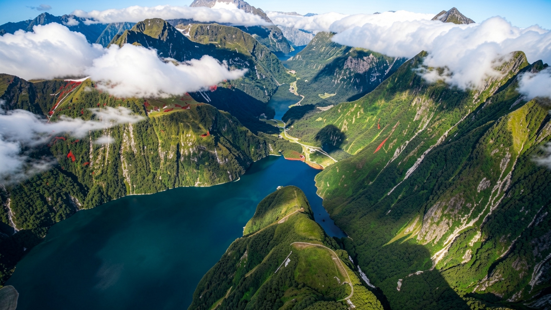 Изображение детально передает текстуру скалистых склонов и насыщенную зелень альпийских лугов. Освещение распределено неравномерно, создавая глубокие тени в расщелинах и яркие блики на поверхности воды. Градиенты неба плавно переходят от глубокого синего к белоснежным массивам облаков, которые частично скрывают вершины. Перед загрузкой доступен удобный предпросмотр для оценки качества отображения всех элементов сцены на вашем экране.