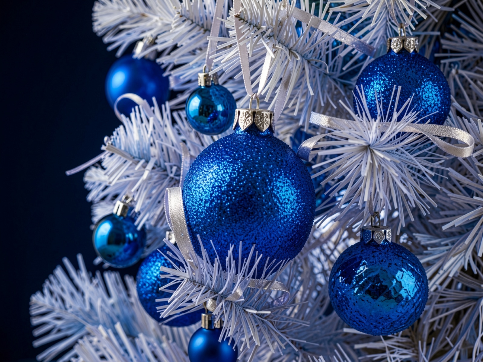 Изображение детально передает зернистую текстуру глиттера на поверхности сфер и мягкий контраст между холодным синим пигментом и белоснежными иглами дерева. Освещение создает точечные блики на глянцевых элементах, а глубокие тени в глубине ветвей формируют объемную композицию с плавными градиентами фона. На сайте доступен удобный предпросмотр перед загрузкой для оценки качества отображения на экране.