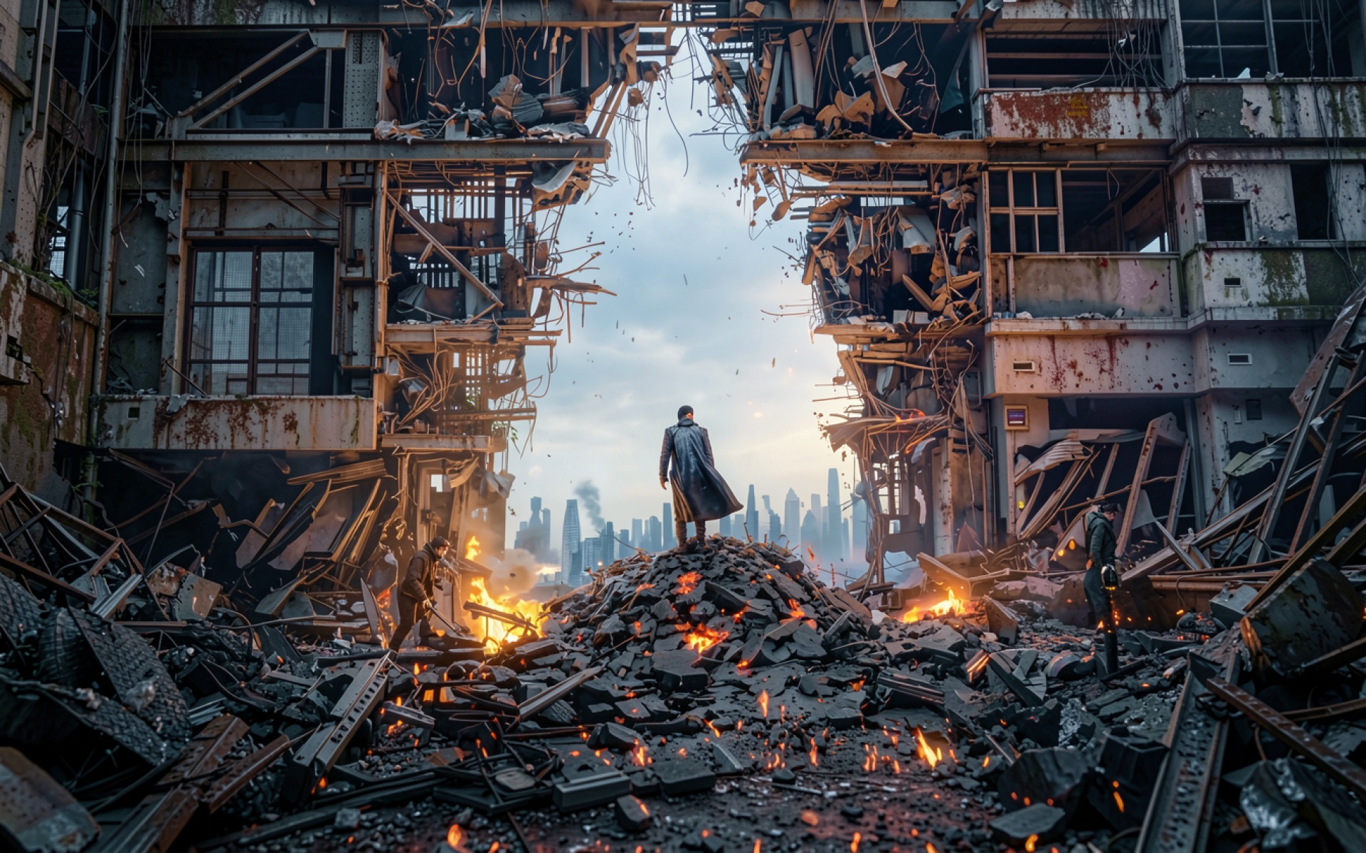 Изображение детально передает текстуру бетона и ржавого металла обломков. Освещение характеризуется контрастом между холодным серым небом и теплыми оранжевыми отблесками огня в нижней части кадра. Градиенты фона плавно переходят от дымчатого горизонта к силуэтам далеких небоскребов, а глубокие тени подчеркивают объем завалов. На сайте доступен удобный предпросмотр перед загрузкой для оценки качества на экране.