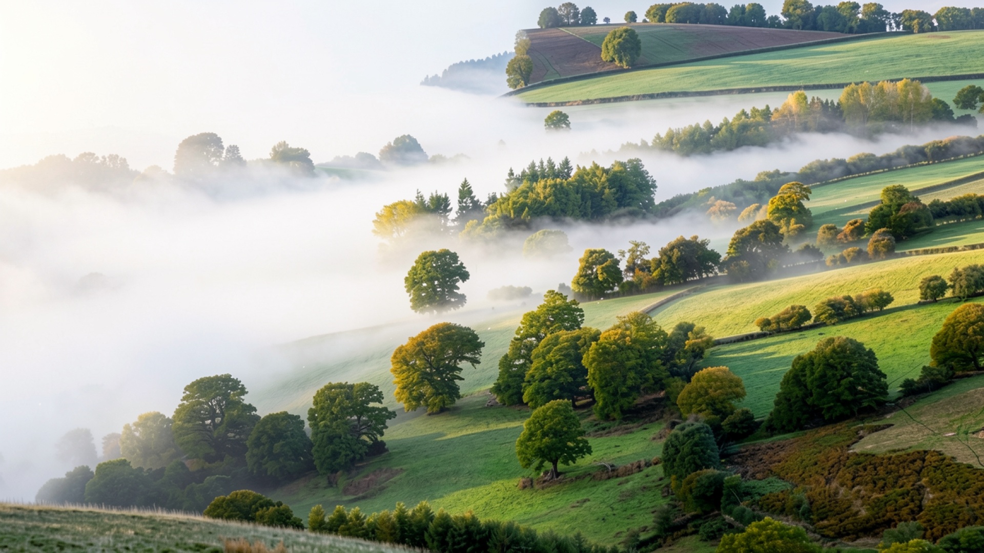Скачайте JPG файл обоев Туманный утренний пейзаж зеленых холмов Англии на нашем сайте – и вот почему: они подходят для профессионального редактирования без артефактов.