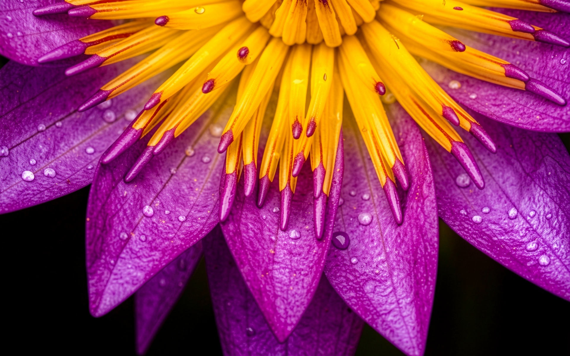 Изображение детально передает бархатистую текстуру лепестков и глянцевую поверхность водяных капель. Контрастное освещение подчеркивает переход от насыщенного пурпурного к ярко-желтому центру, создавая глубокие тени в основании цветка. Градиенты фона плавно уходят в черный цвет, что акцентирует внимание на бликах света на поверхности росы. На сайте доступен удобный предпросмотр перед скачиванием для оценки качества на экране.