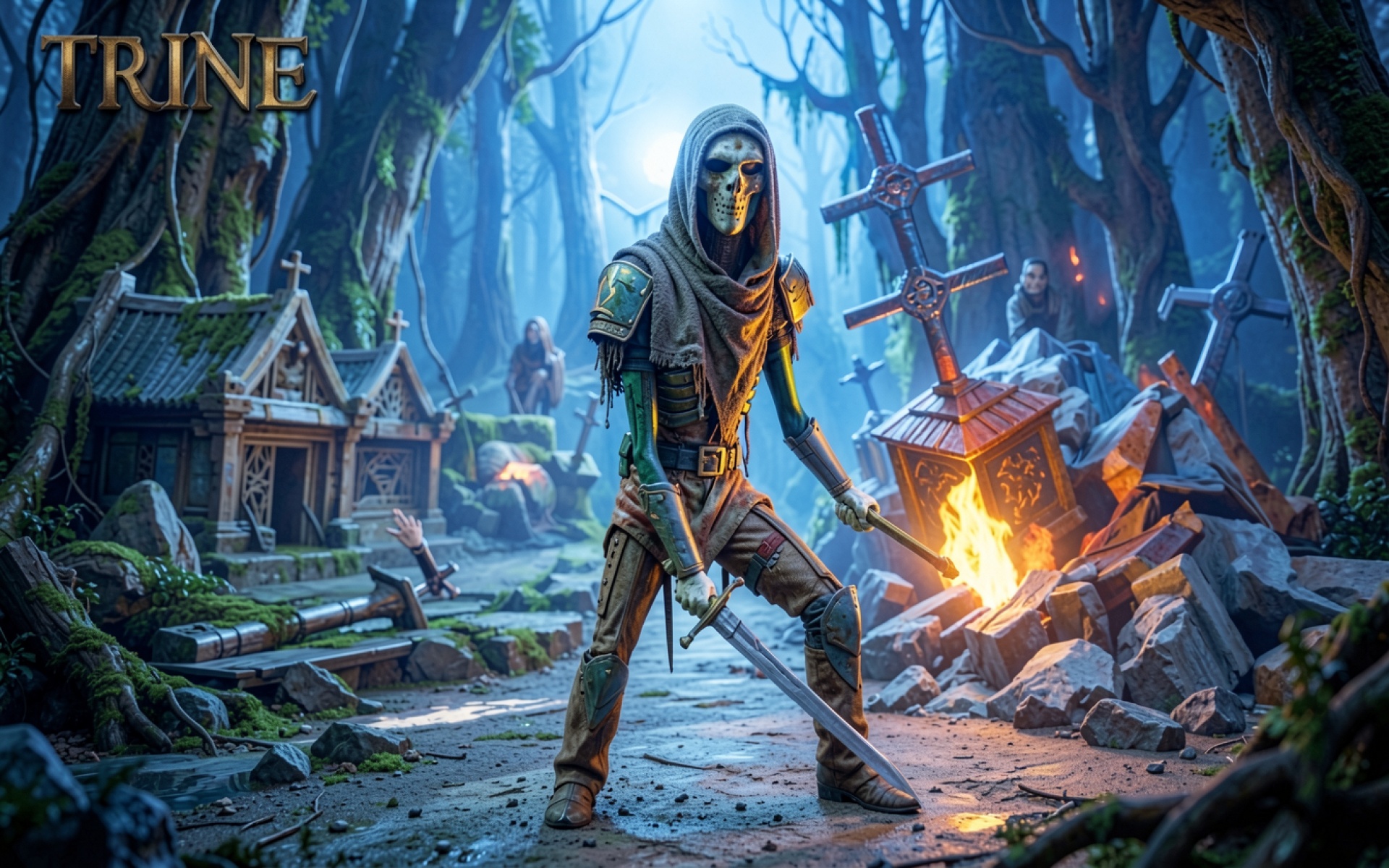Изображение детально передает текстуру кости и грубую ткань капюшона, создавая контраст с мягким светом факела. Освещение выстроено через игру теплых оранжевых бликов от огня и холодных синих градиентов туманного леса на заднем плане. Глубокие тени подчеркивают объем каменных гробниц и изгибы старых деревьев. На сайте предусмотрен удобный предпросмотр перед скачиванием, чтобы оценить качество отображения всех элементов на экране.