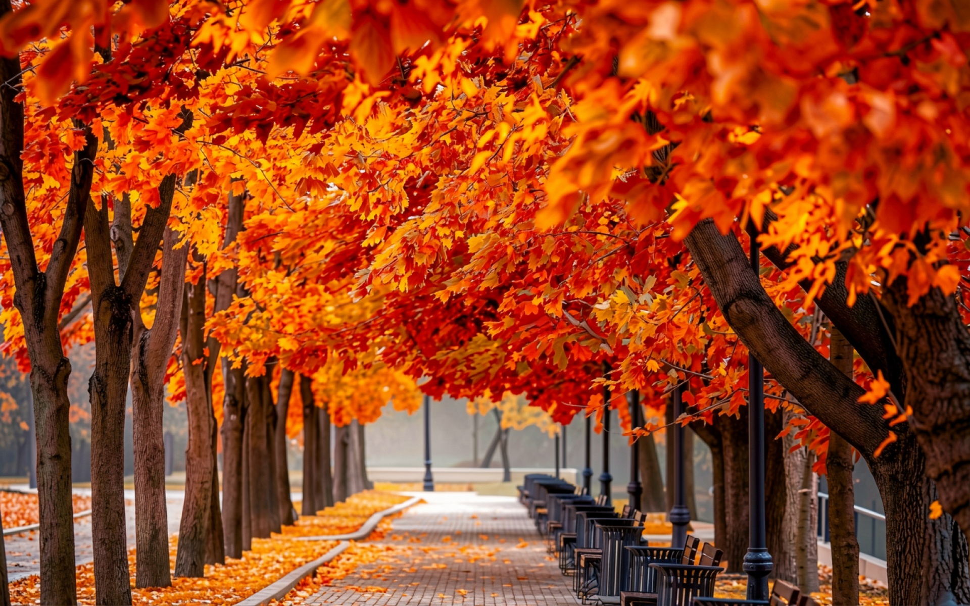 Данное изображение выделяется детальной проработкой текстуры коры деревьев и насыщенностью красных оттенков листвы. Мягкое освещение создает плавные градиенты на заднем плане, а глубокие тени под кронами подчеркивают объем аллеи. Контраст между темными скамейками и ярким ковром из опавших листьев добавляет сцене реализма. На сайте доступен удобный предпросмотр перед загрузкой, чтобы оценить качество отображения на вашем экране.