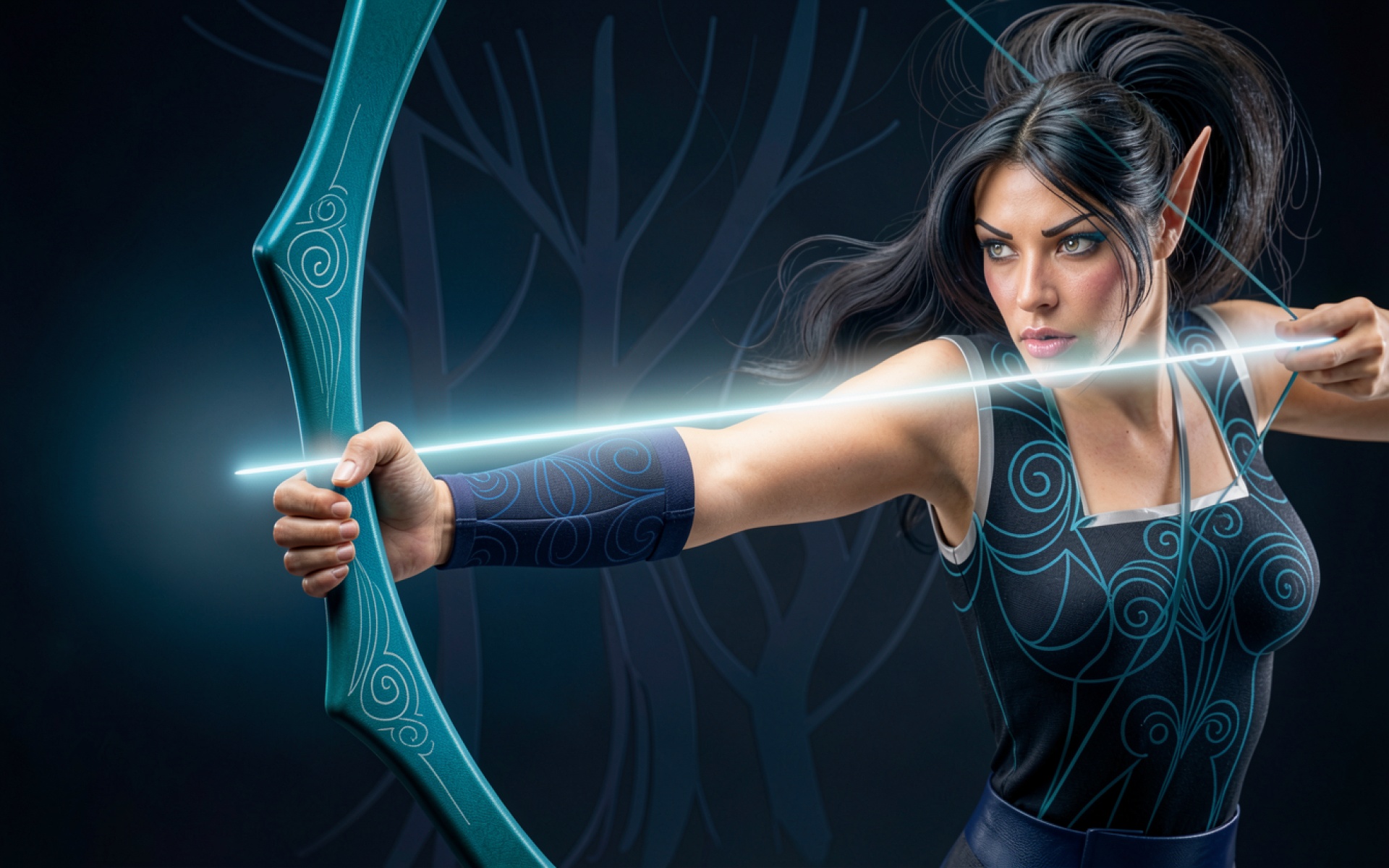 Изображение отличается детальной проработкой текстуры кожи и ткани костюма с голубыми узорами. Освещение сосредоточено на светящейся тетиве лука, которая создает яркие блики на лице и руках персонажа. Глубокие тени в темном лесу создают контраст с неоновым свечением оружия, а плавные градиенты фона подчеркивают мистическую атмосферу. На сайте доступен удобный предпросмотр перед скачиванием для оценки качества на экране.