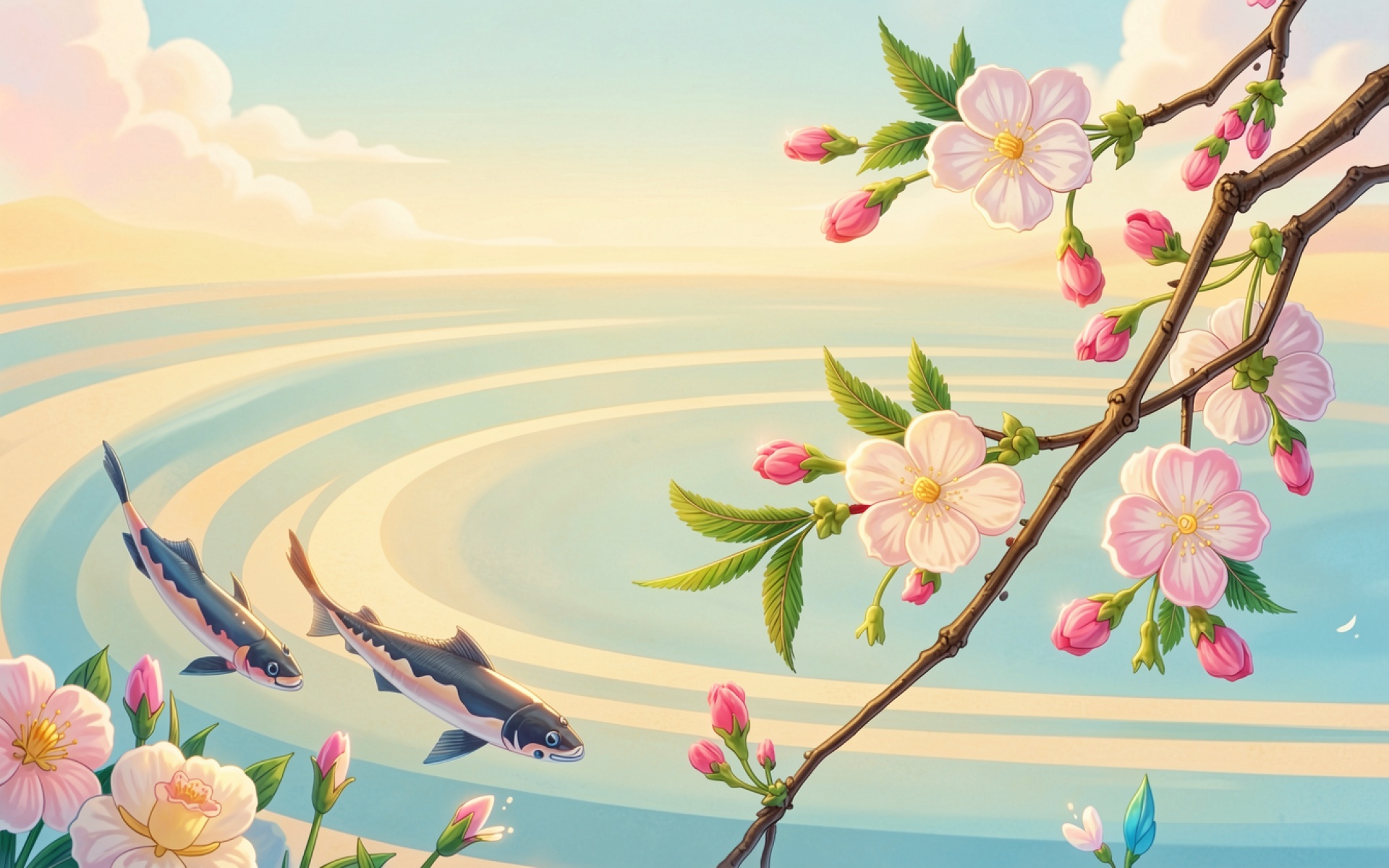 Изображение детально передает чешую рыб и мягкие лепестки цветов. Освещение имитирует раннее утро с теплыми градиентами на заднем плане и плавными переходами теней в воде. Контраст между розовыми бутонами и голубыми оттенками пруда создает баланс композиции. На сайте доступен удобный предпросмотр перед скачиванием для оценки качества на экране.