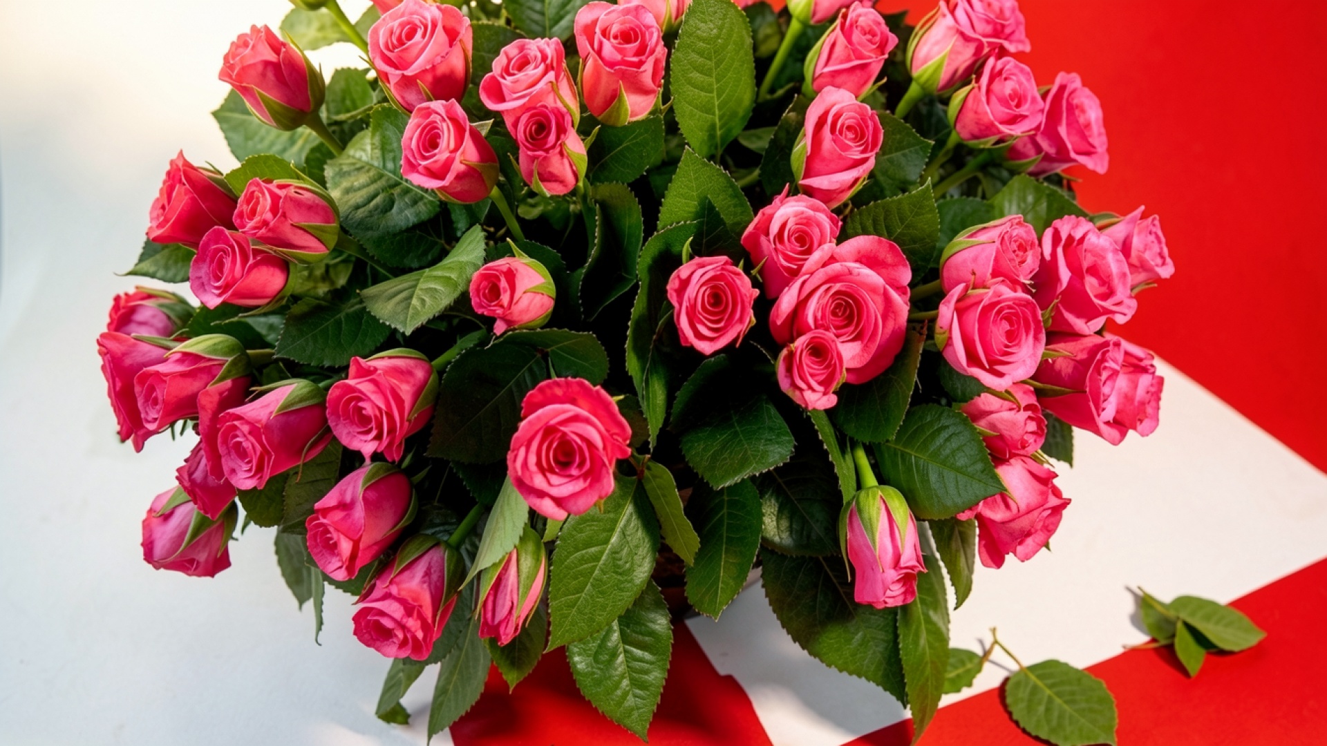 Букет розовых роз на красном фоне обои