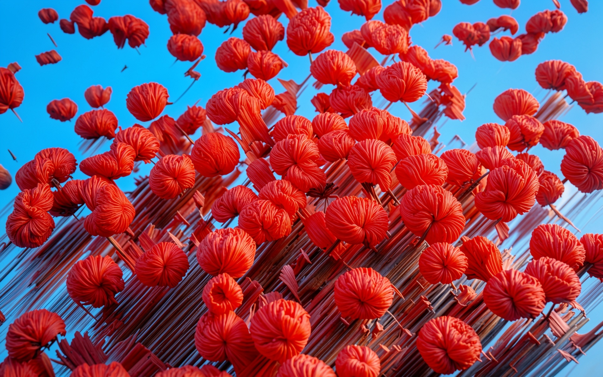 Изображение характеризуется высокой контрастностью между насыщенным алым цветом сфер и глубоким лазурным градиентом заднего плана. Текстура каждого шара передана через четкие линейные складки, которые создают ритмичный рисунок теней и ярких бликов при фронтальном освещении. Мягкие переходы света на поверхности объектов подчеркивают их объем, а тонкие соединительные элементы добавляют композиции графическую строгость. Перед загрузкой на сайте доступен удобный предпросмотр для оценки качества отображения на вашем экране.