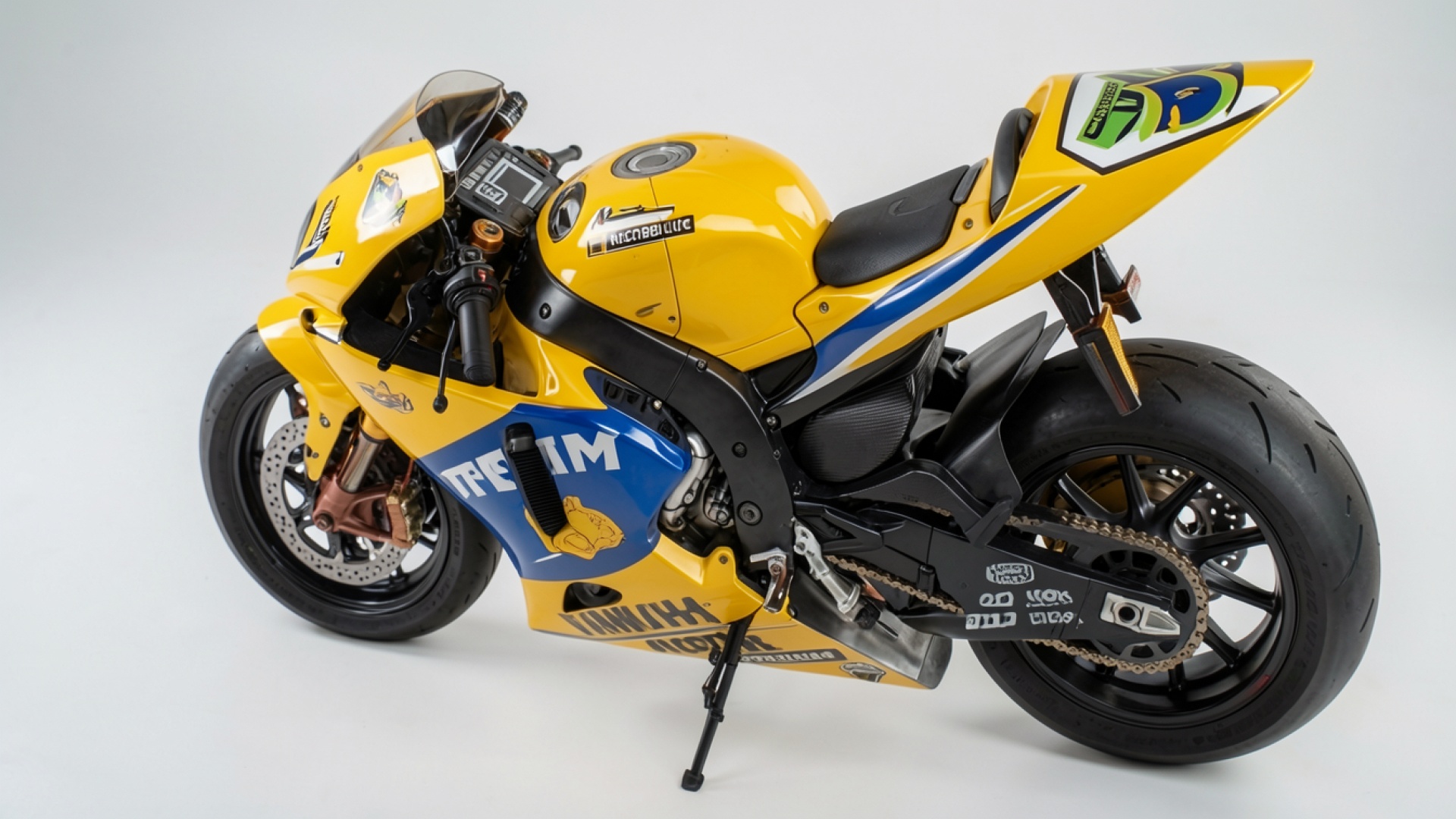 Изображение детально передает глянцевую текстуру пластикового обтекателя и матовый металл рамы. Освещение в студии создает мягкие блики на топливном баке и четкие тени под колесами, подчеркивая геометрию байка. Плавные градиенты белого фона исключают визуальный шум, акцентируя внимание на контрасте желтого цвета с синими графическими элементами. На сайте доступен удобный предпросмотр перед загрузкой для оценки качества отображения на экране.