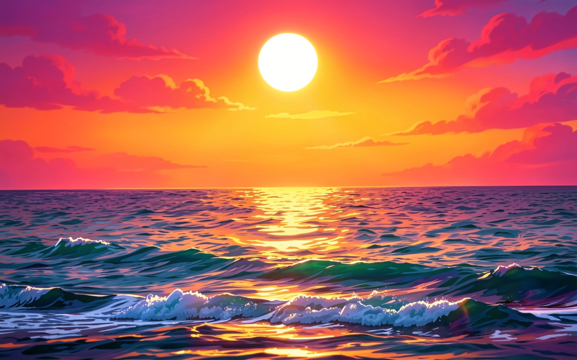 Изображение отличается детальной проработкой пены морских волн и плавными градиентами неба от ярко-желтого до глубокого пурпурного. Освещение создает четкие блики на поверхности воды, подчеркивая динамику прилива и объем облаков. Контрастные тени в нижней части кадра добавляют глубины композиции. На сайте предусмотрен удобный предпросмотр перед загрузкой для оценки качества отображения на вашем экране.