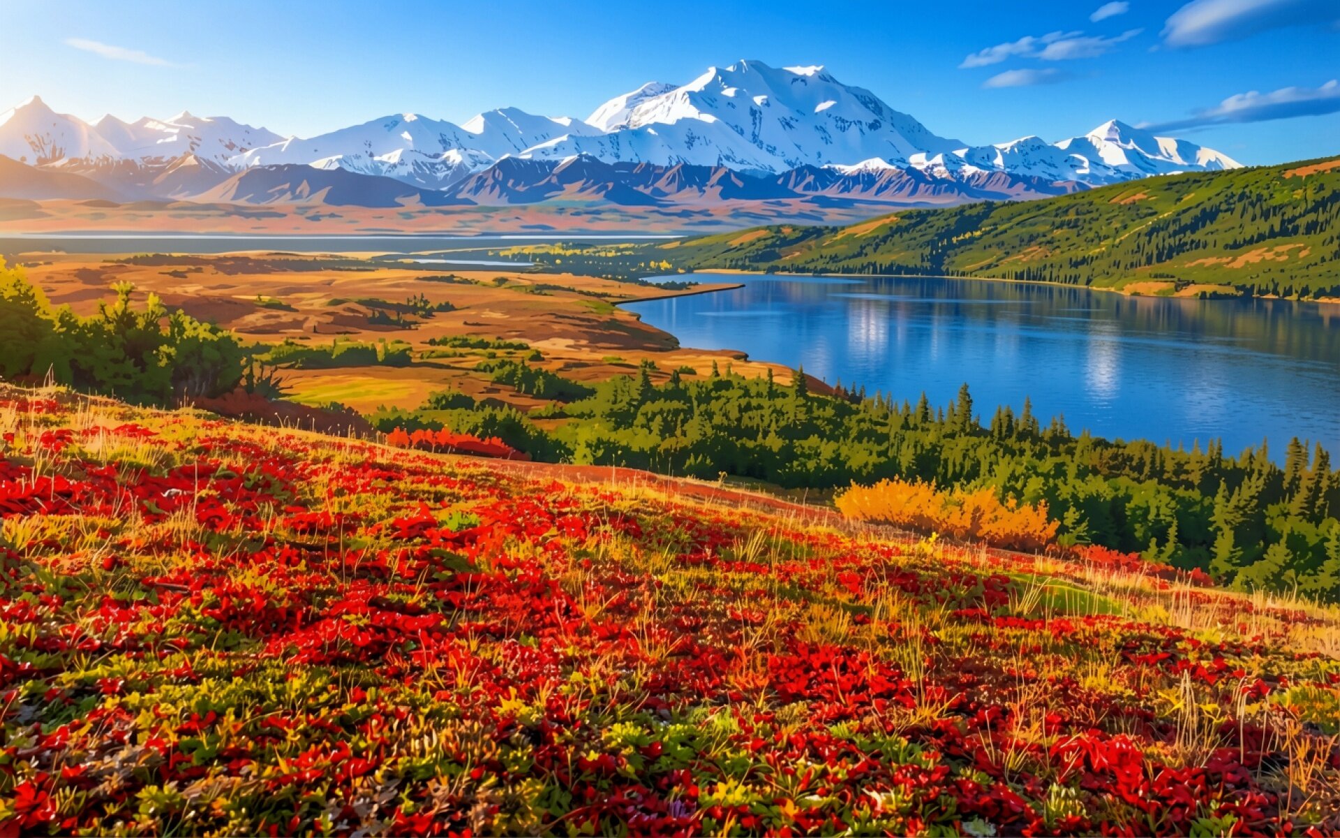 Изображение характеризуется высокой детализацией текстур растительного покрова на переднем плане и плавными градиентами синего в акватории озера. Освещение имитирует яркий дневной свет, создавая четкие контрасты между заснеженными вершинами гор и насыщенным красным оттенком флоры. Глубокие тени в хвойных лесах подчеркивают объем ландшафта, а блики на поверхности воды добавляют сцене реализма. На сайте доступен удобный предпросмотр перед скачиванием для оценки качества на экране.