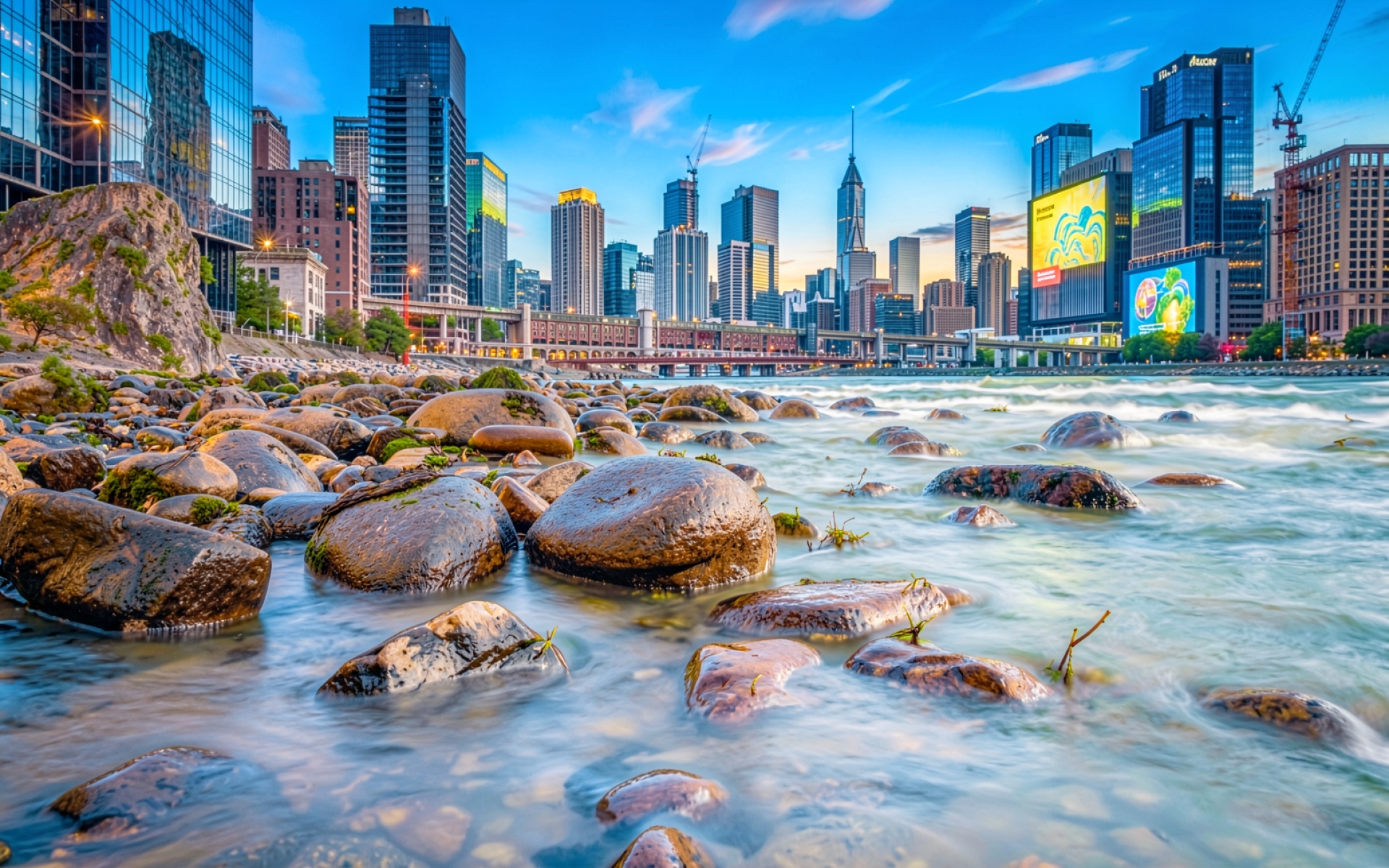 На нашем сайте можно скачать обои в JPG для ПК или телефона Городской пейзаж с рекой и небоскребами. Почему стоит скачать именно у нас JPG обои «Городской пейзаж с рекой и небоскребами»? Потому что сохранена полная цветопередача без потери качества.