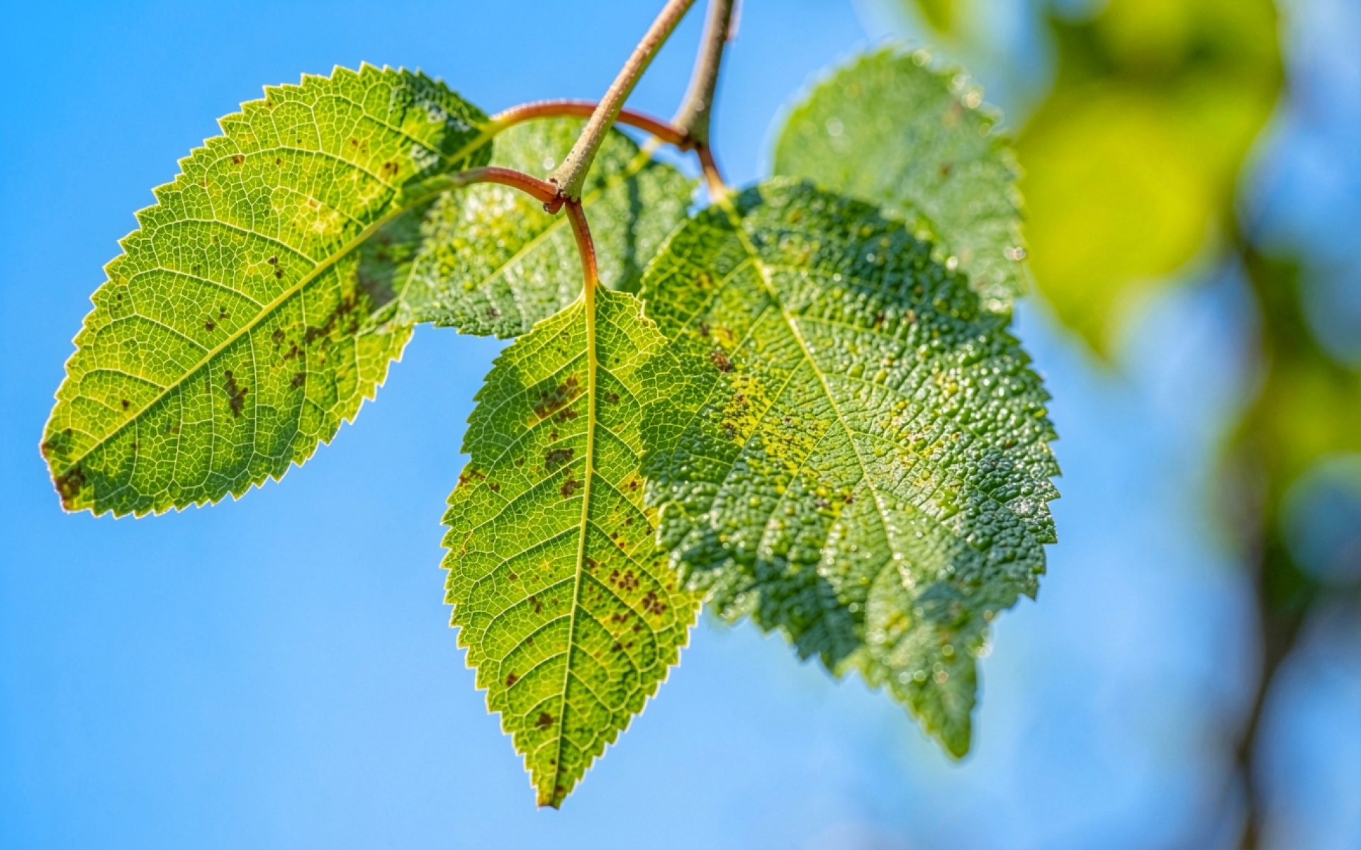 Изображение детально передает структуру листовых пластин, подчеркивая каждую прожилку и зазубренный край. Естественное освещение создает мягкие блики на поверхности, а градиент синего неба обеспечивает высокий контраст с насыщенным зеленым цветом. Текстура листа выглядит объемной благодаря правильной проработке теней в местах прикрепления к ветке. На сайте доступен удобный предпросмотр перед скачиванием для оценки качества на экране.