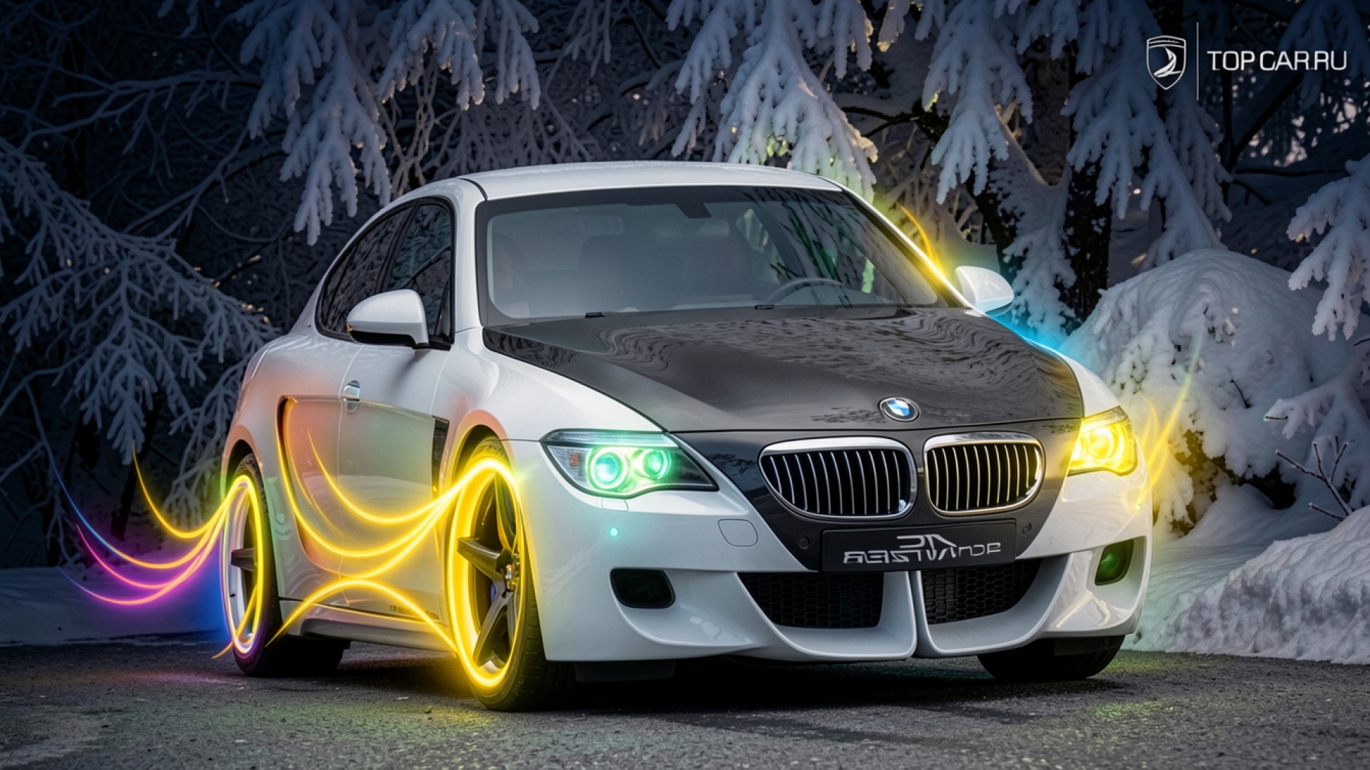 Изображение детально передает контраст между глянцевым белым кузовом и матовым темным капотом. Освещение акцентирует внимание на неоновых световых шлейфах вокруг колес, создавая динамические блики на заснеженном покрытии. Градиенты фона плавно переходят от глубоких синих теней в лесной чаще к яркому белому цвету снега на ветвях деревьев. Перед загрузкой доступен удобный предпросмотр для оценки качества отображения всех текстур на вашем экране.