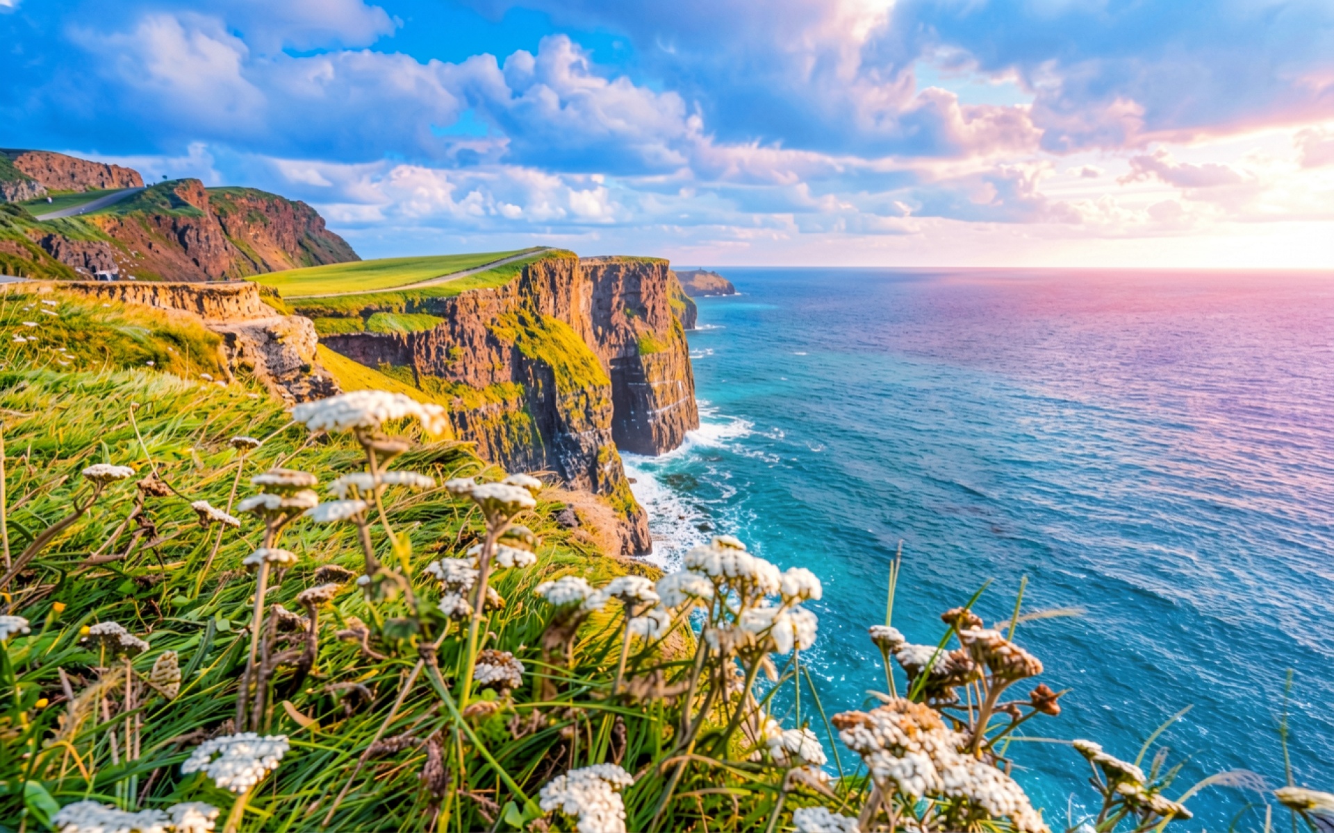 Доступны для скачивания JPG обои 'Скалистые утесы Мохер при закатном солнечном свете'. Почему стоит скачать их? Файл оптимизирован для установки на рабочий стол и экран телефона.