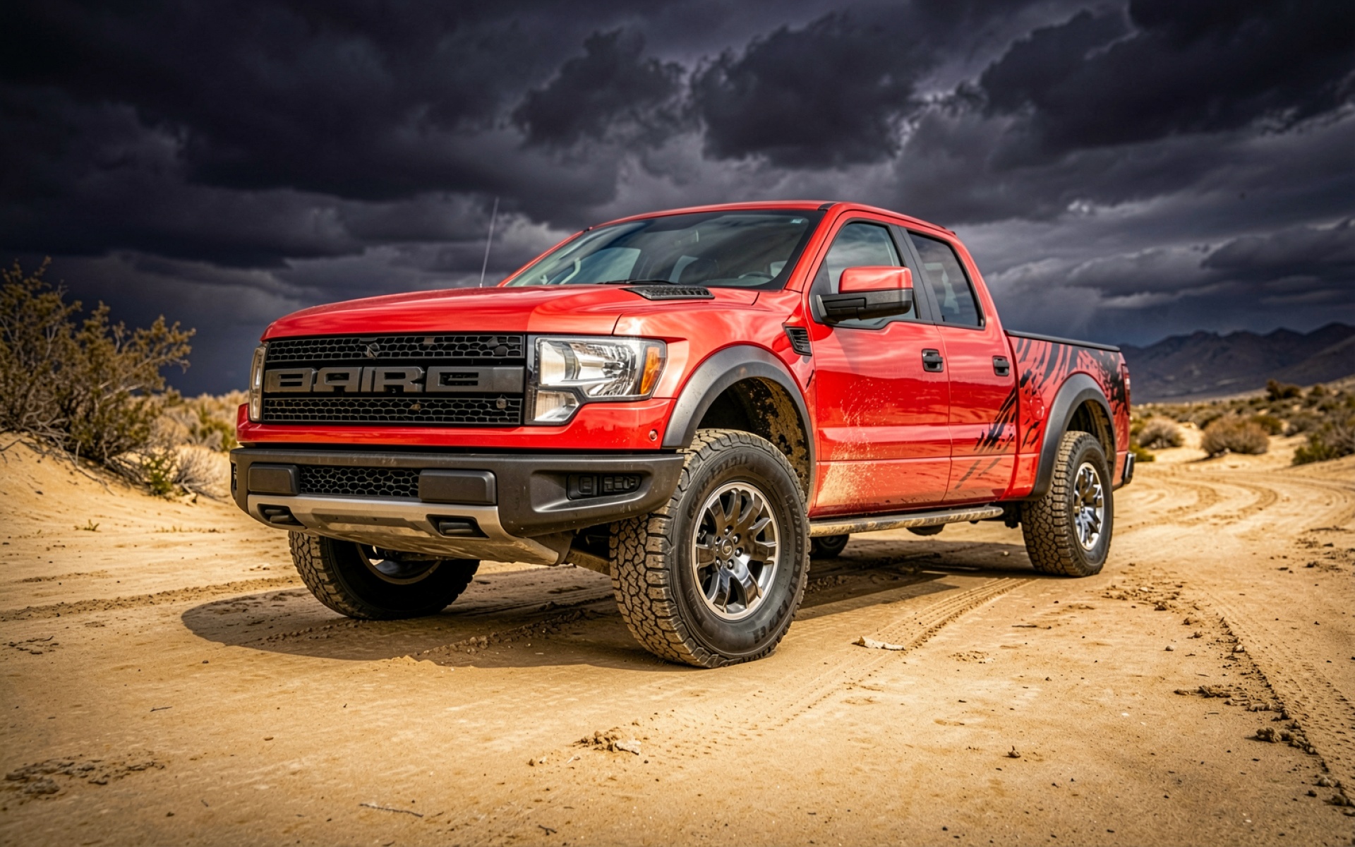 Красный пикап Ford в пустыне под грозовым небом обои