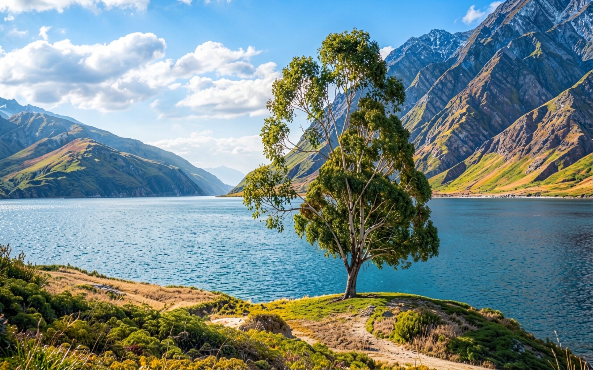 Изображение отличается детальной проработкой листвы и текстуры коры дерева, которые контрастируют с гладкой поверхностью воды. Освещение имитирует яркий дневной свет, создавая четкие тени на склоне холма и мягкие градиенты в области горного горизонта. На сайте доступен удобный предпросмотр перед загрузкой, чтобы оценить качество цветопередачи на вашем экране.