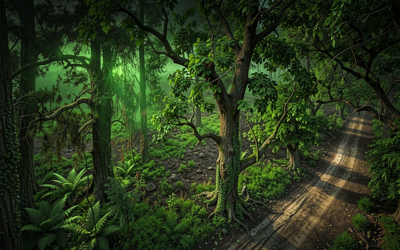 Изображение отличается высокой детализацией коры деревьев и текстуры папоротников. Особое внимание уделено игре света в густом тумане, создающем мягкие градиенты зеленого цвета и глубокие тени в подлеске. Блики на влажной поверхности лесной дороги подчеркивают объем сцены. На сайте доступен удобный предпросмотр перед скачиванием, чтобы оценить качество на экране.