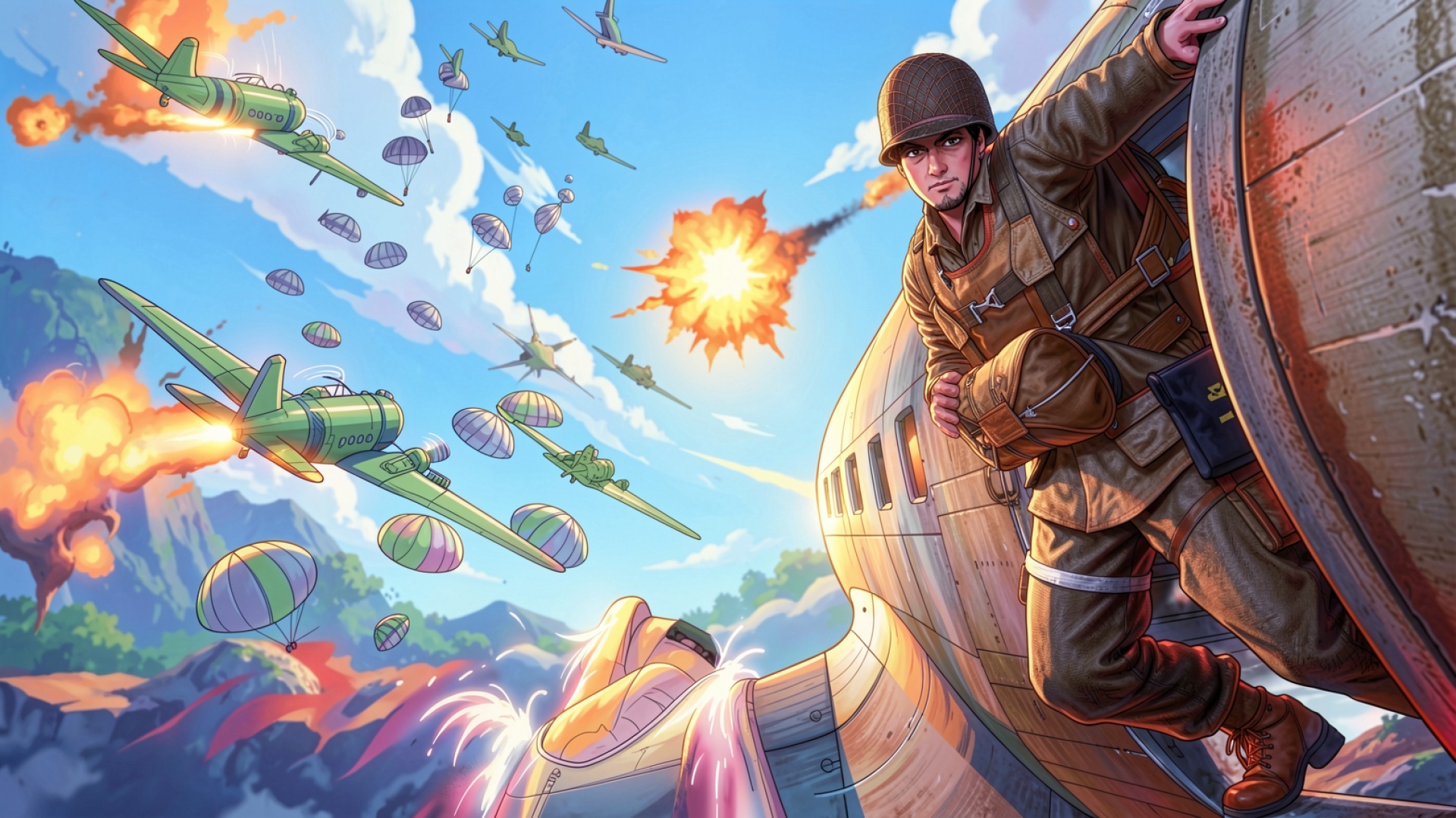 Изображение отличается высокой детализацией текстуры кожаной амуниции, грубой ткани обмундирования и металлического блеска фюзеляжа. Освещение имитирует яркий дневной свет с выраженными бликами на шлеме и глубокими тенями в проеме люка. Плавные градиенты голубого неба контрастируют с резкими вспышками взрывов, создавая динамичную композицию. Перед скачиванием доступен удобный предпросмотр, позволяющий оценить четкость каждой детали на вашем экране.