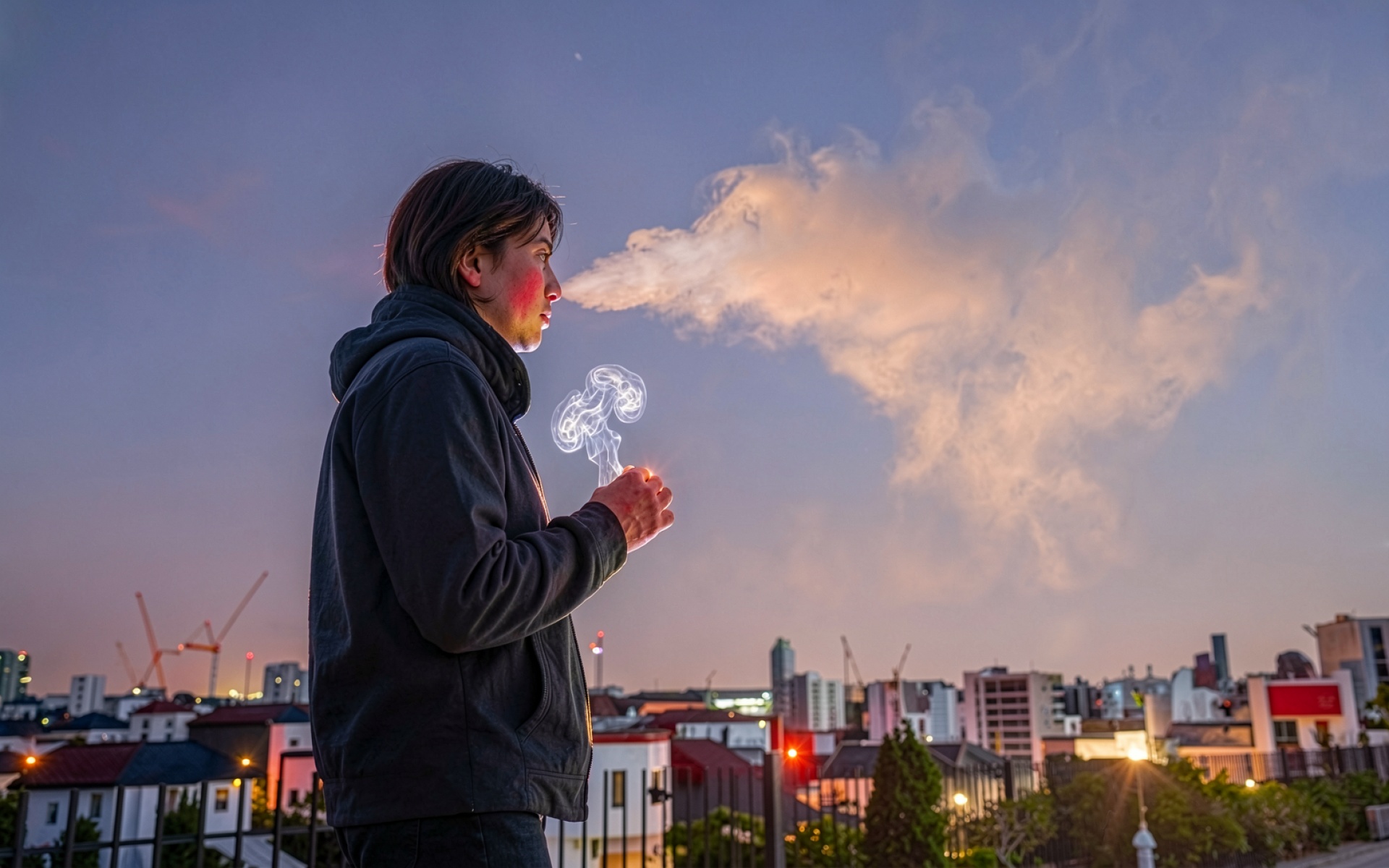 Изображение отличается высокой детализацией текстуры ткани темной кофты и плавными градиентами вечернего неба. Особое внимание уделено динамике дыма: мягкие переходы света и тени создают объемный эффект облака, которое контрастирует с четкими линиями городской архитектуры на заднем плане. Перед загрузкой работает удобный предпросмотр, позволяющий оценить точность цветопередачи и чистоту бликов на экране.
