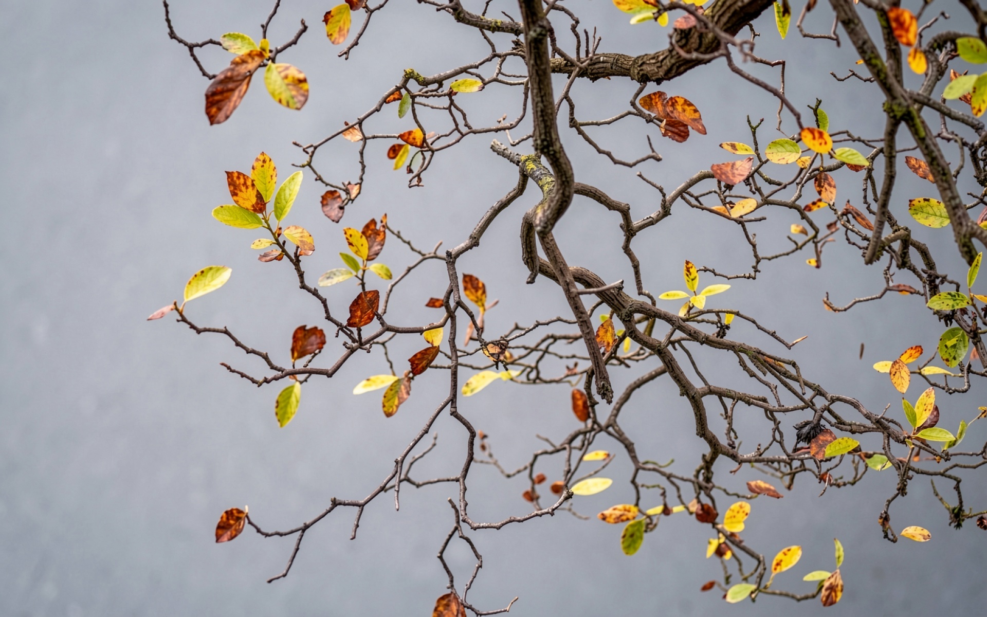 Изображение отличается высокой детализацией коры и четкостью прожилок каждого листа. Освещение создает мягкие градиенты на сером фоне, подчеркивая контраст между темными изгибами ветвей и яркими охристыми оттенками листвы. Тонкие блики на поверхности древесины и естественные тени добавляют глубины композиции. Перед скачиванием доступен удобный предпросмотр, позволяющий оценить чистоту цветовых переходов на вашем экране.