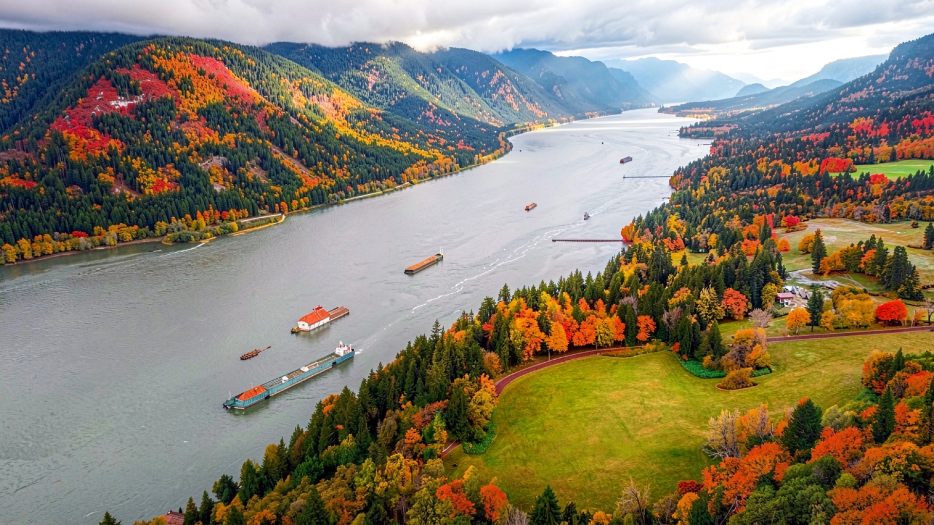 Изображение отличается высокой детализацией текстур осенней листвы и водной глади. Освещение создает мягкие градиенты на склонах гор, а блики на поверхности реки подчеркивают движение барж. Тени в лесных массивах переданы глубоко, что обеспечивает объем композиции. На сайте доступен удобный предпросмотр перед скачиванием, чтобы оценить качество на экране.